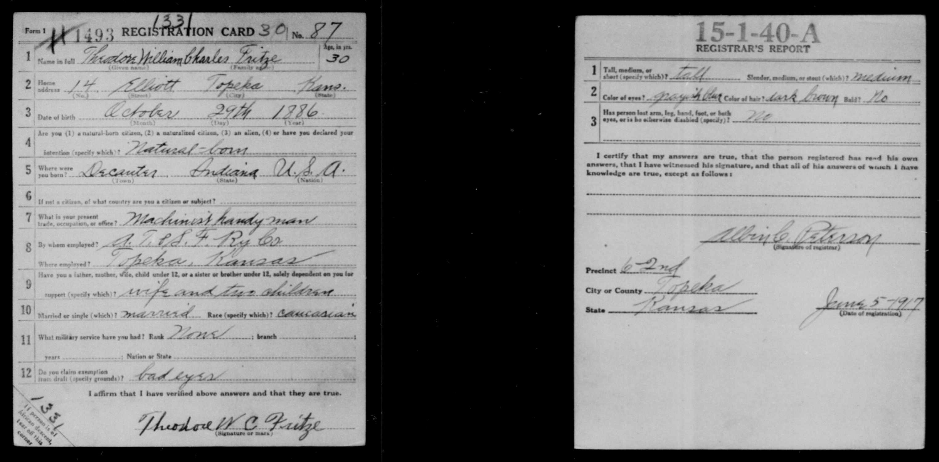 He registered for the Draft for World War I on 06/05/1917 in Topeka, Shawnee, Kansas . [6] |