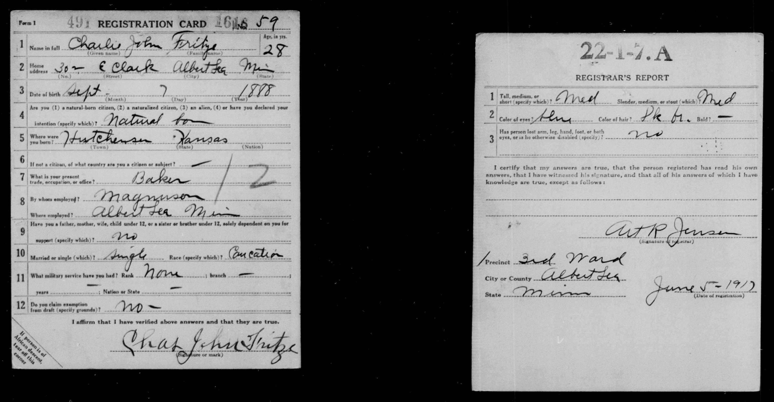 Ancestry.com Operations, Inc., U.S. World War I Draft Registration Cards, 1917-1918, Charlie John Fritze; Database and images, Ancestry.com LLC, Ancestry.com : 2005 (http://www.Ancestry.com/ : accessed 12/02/2011); citing National Archives and Records Administration, United States Selective Service System, "World War I Selective Service System Draft Registration Cards, 1917-1918," Washington, DC, Series M1509, 4,582 rolls [Surety: 3]. |