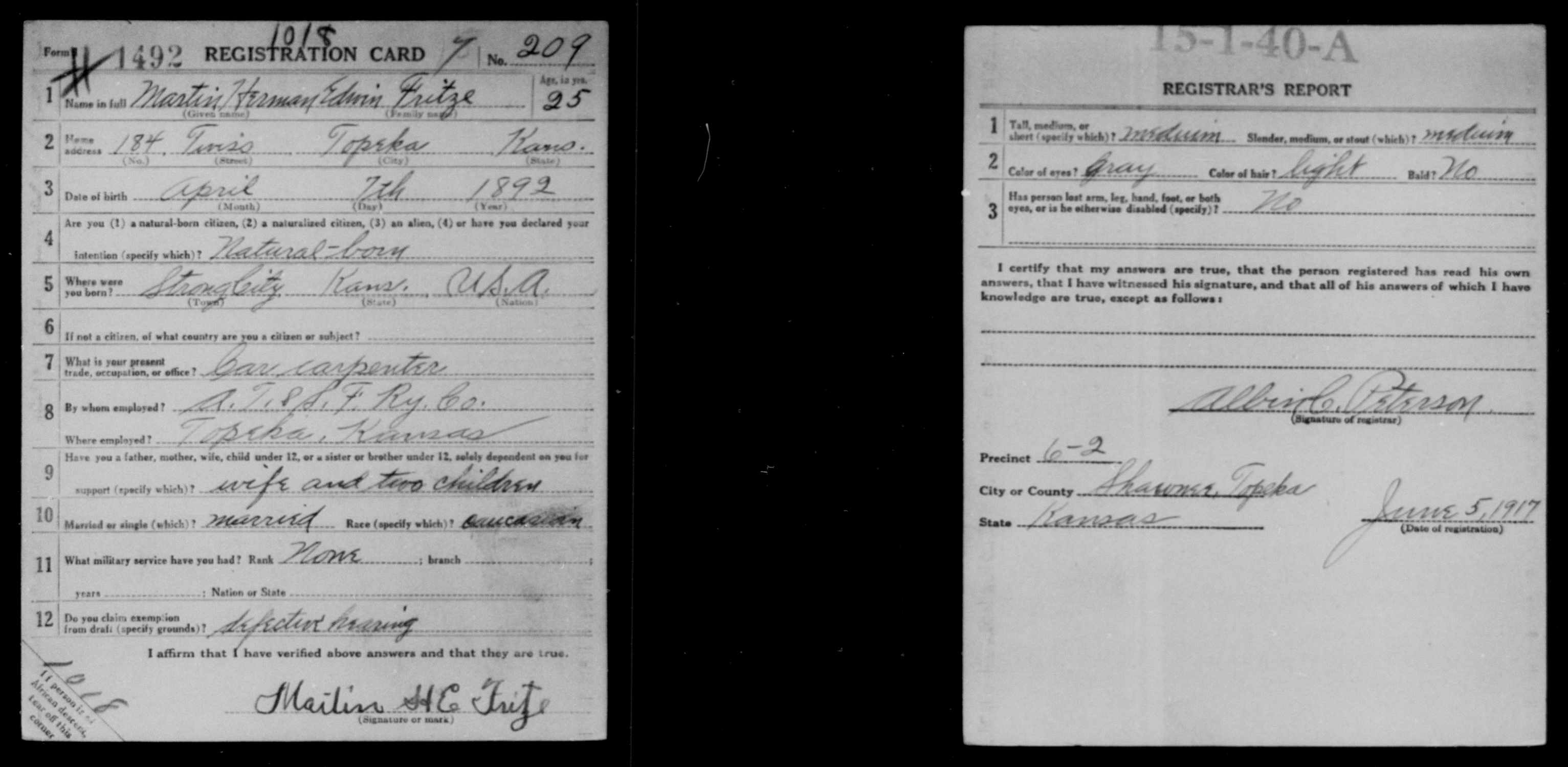 Ancestry.com Operations, Inc., U.S. World War I Draft Registration Cards, 1917-1918, Martin Herman Edwin Fritze; Database and images, Ancestry.com LLC, Ancestry.com : 2005 (http://www.Ancestry.com/ : accessed 12/04/2011); citing National Archives and Records Administration, United States Selective Service System, "World War I Selective Service System Draft Registration Cards, 1917-1918," Washington, DC, Series M1509, 4,582 rolls [Surety: 3]. |
