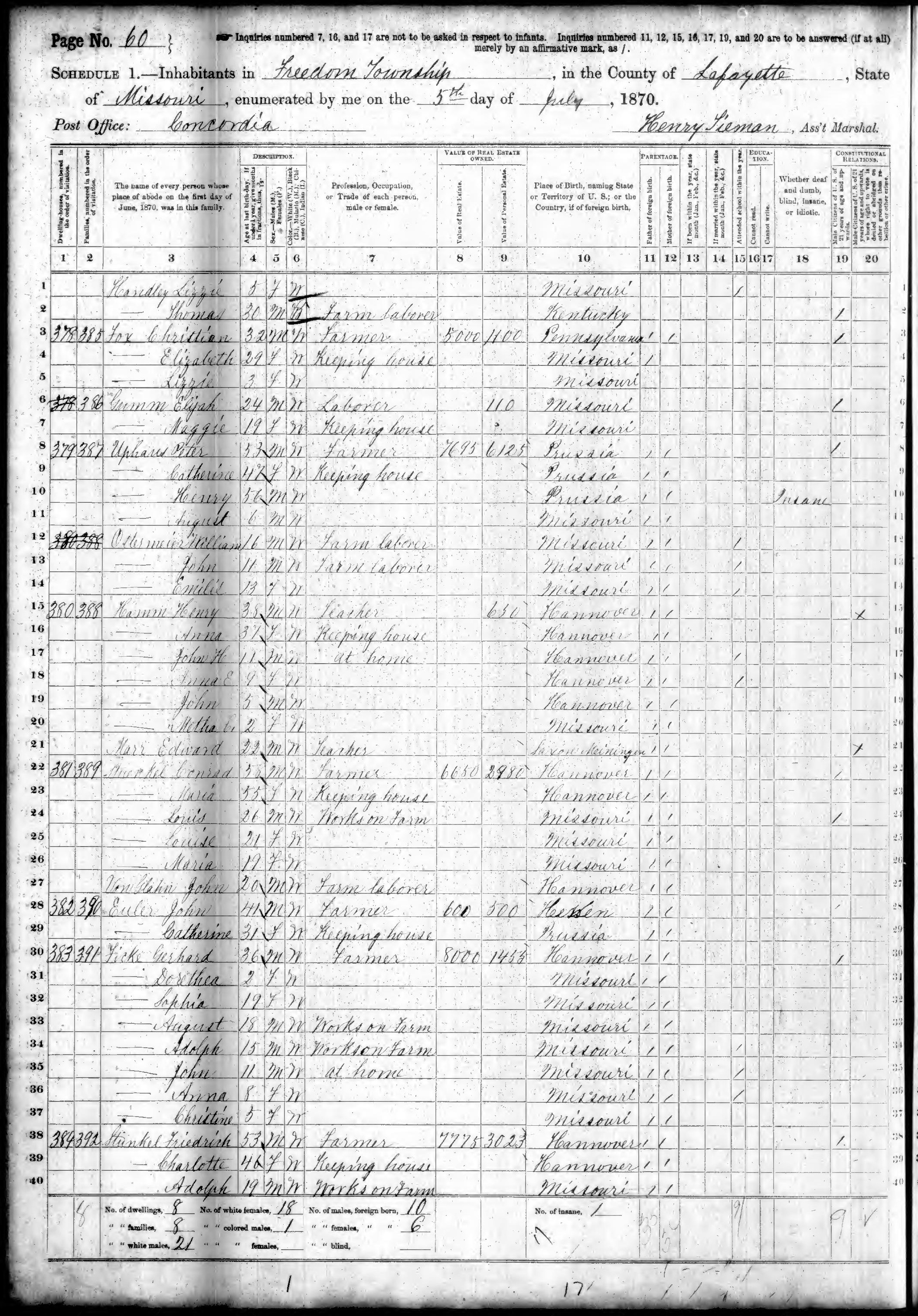 Ancestry.com Operations, Inc., 1870 United States Census, Freedom, Lafayette, MO, page 60, dwelling 380, family 388, line 17, Hamm, John H; Database and images, Ancestry.com LLC, Ancestry.com : 2009 (http://www.Ancestry.com/ : accessed 03/05/2012); citing Ninth Census of the United States, 1870 U. S. Census, population schedules, National Archives and Records Administration Microfilm Publication M593 (1761 rolls), Records of the Bureau of the Census, Record Group 29, National Archives, Washington, DC, roll 786, image 510 [Surety: 3]. |