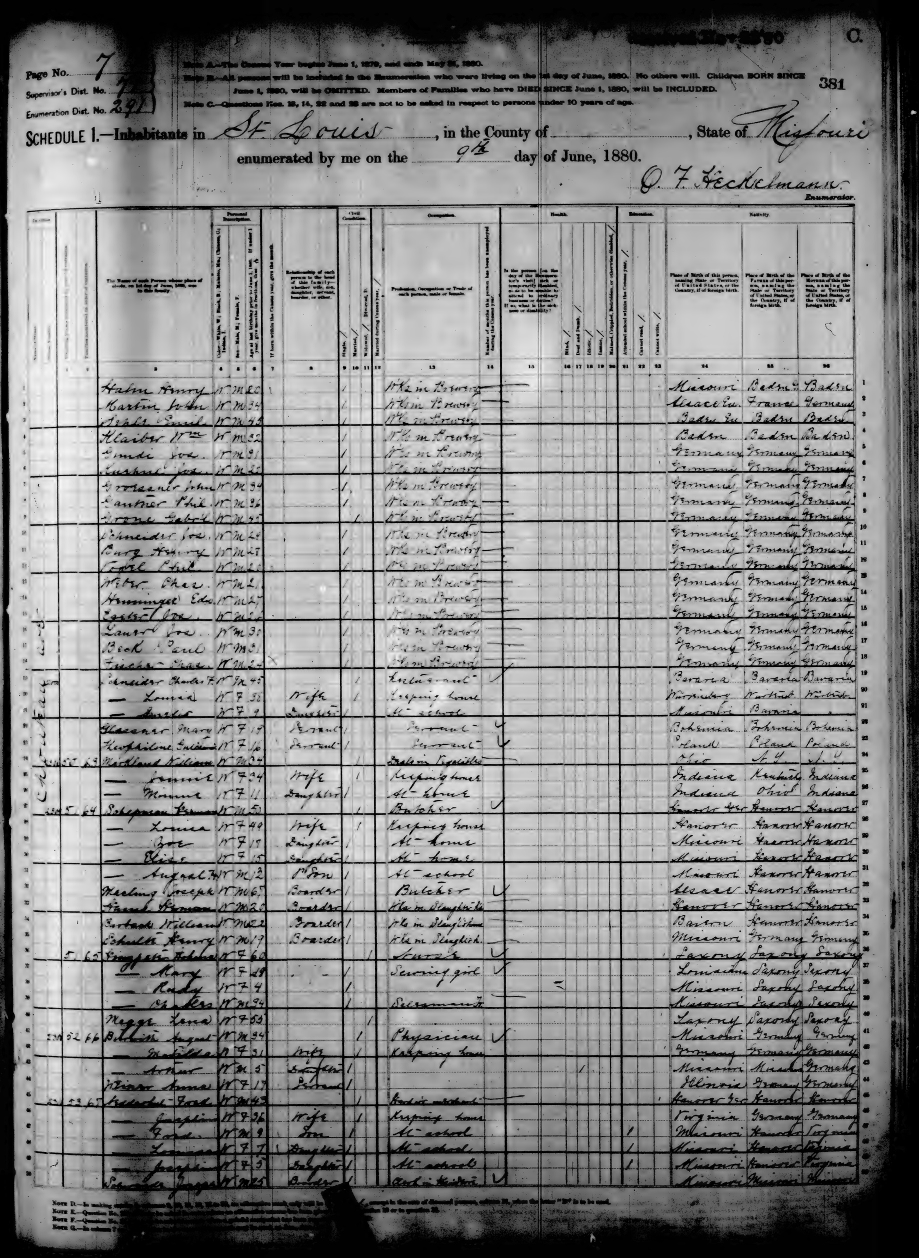 Ancestry.com Operations, Inc., 1880 United States Federal Census, ED 291, St Louis City, MO, page 7, dwelling 51, family 64, line 33, Hams, Herman; Database and images, Ancestry.com LLC, Ancestry.com : 2010 (http://www.Ancestry.com/ : accessed 07/16/2024); citing Tenth Census of the United States, 1880 U. S. Census, population schedules, National Archives and Records Administration Microfilm Publication T9 (1454 rolls), Records of the Bureau of the Census, Record Group 29, National Archives, Washington, DC, roll 732, image 765 [Surety: 3]. |