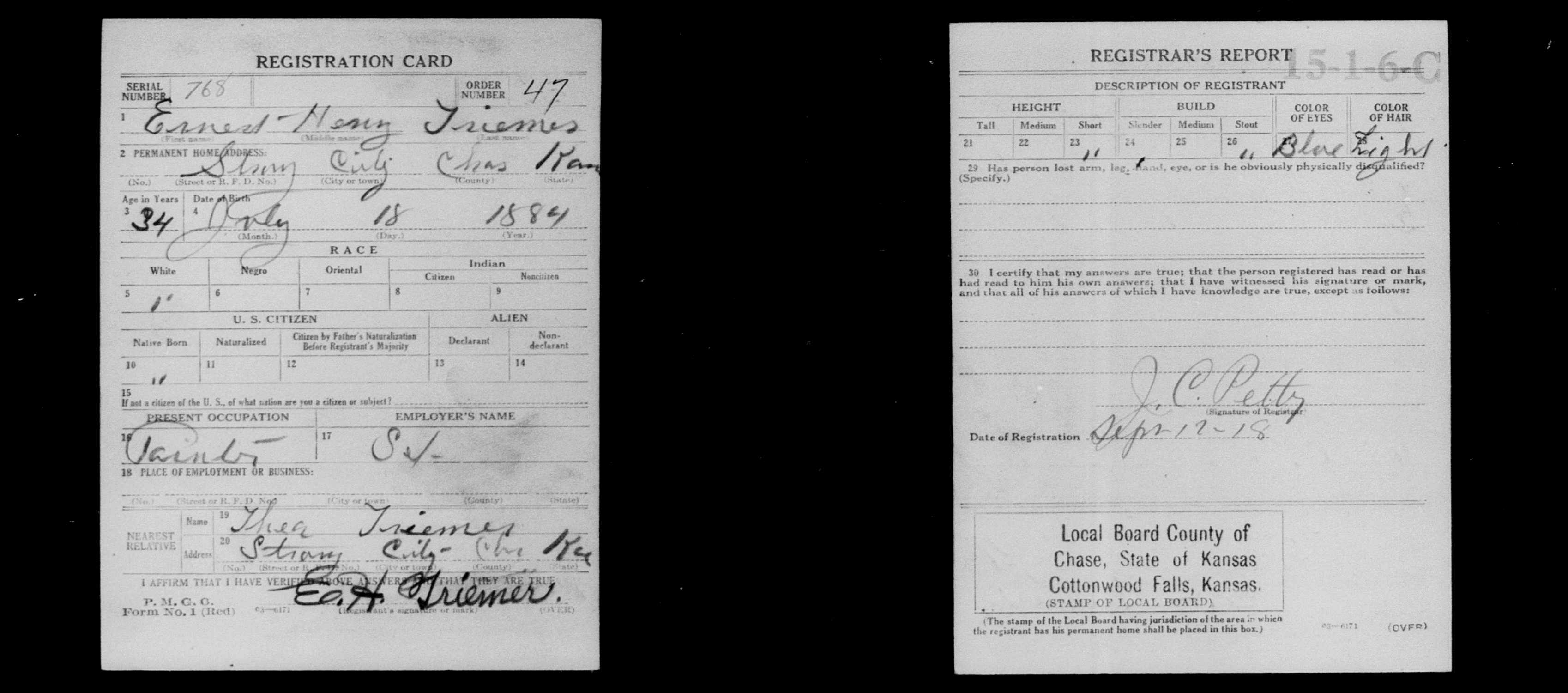 He registered for the Draft for World War I on 09/12/1918 in Cottonwood Falls, Chase, Kansas . [5] |