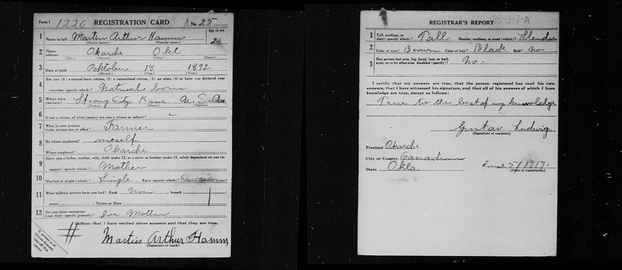 Ancestry.com Operations, Inc., U.S. World War I Draft Registration Cards, 1917-1918, Martin Arthur Hamm; Database and images, Ancestry.com LLC, Ancestry.com : 2005 (http://www.Ancestry.com/ : accessed 12/18/2011); citing National Archives and Records Administration, United States Selective Service System, "World War I Selective Service System Draft Registration Cards, 1917-1918," Washington, DC, Series M1509, 4,582 rolls [Surety: 3]. |
