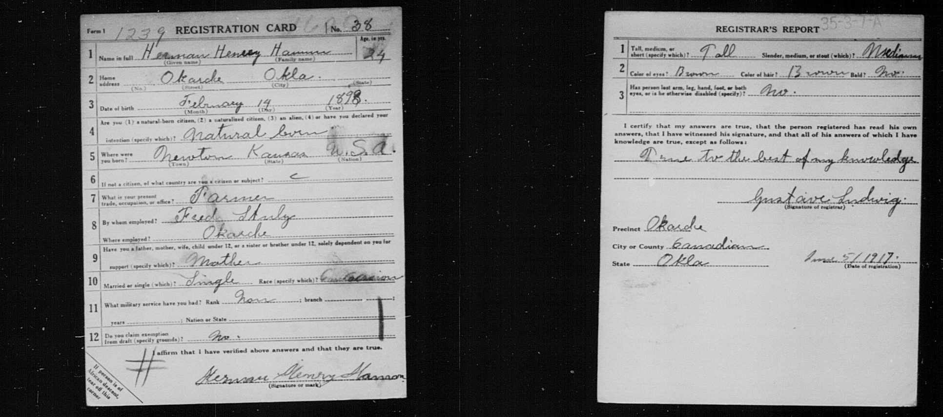 He registered for the Draft for World War I on 06/05/1917 in Okarche, Canadian, Oklahoma . [3] |