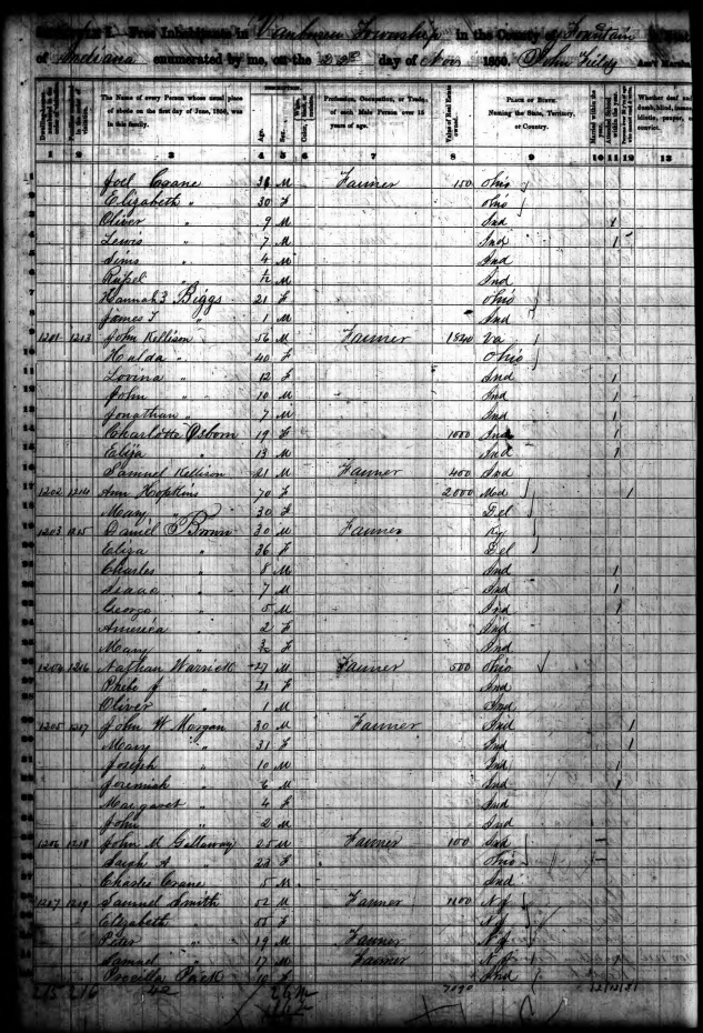 Ancestry.com Operations, Inc., 1850 United States Federal Census, Van Buren, Fountain, IN, page 30, dwelling 1201, family 1213, line 13, Jonathan Kellison; Database and images, Ancestry.com LLC, Ancestry.com : 2009 (http://www.Ancestry.com/ : accessed 02/26/2020); citing Seventh Census of the United States, 1850 U. S. Census, population schedules, National Archives and Records Administration Microfilm Publication M432 (1009 rolls), Records of the Census Bureau, Record Group 29, National Archives, Washington, DC, roll 145, image 536 [Surety: 3]. |