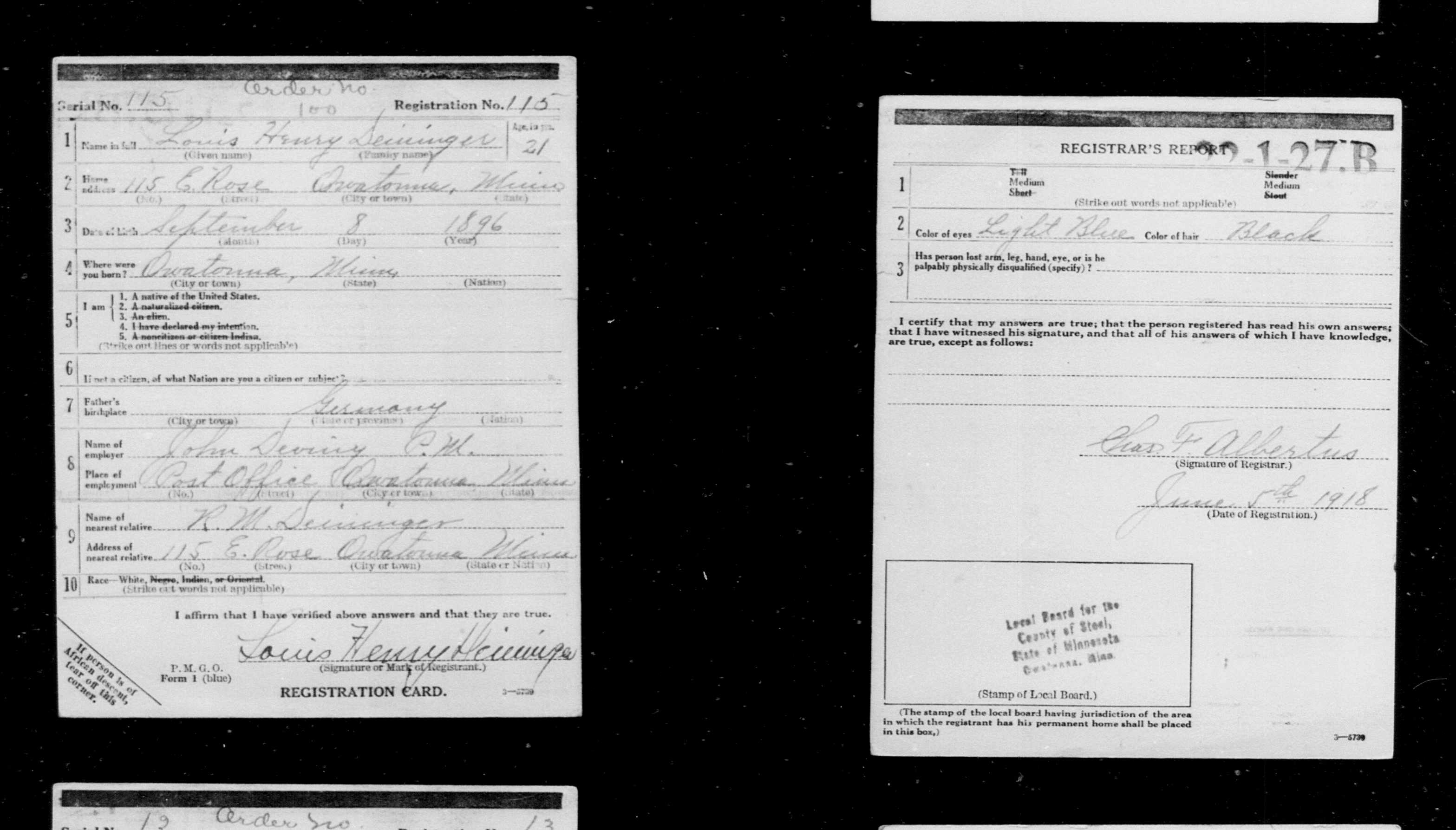 He registered for the Draft for World War I on 06/05/1918 in Owatonna, Steele, Minnesota . [5] |