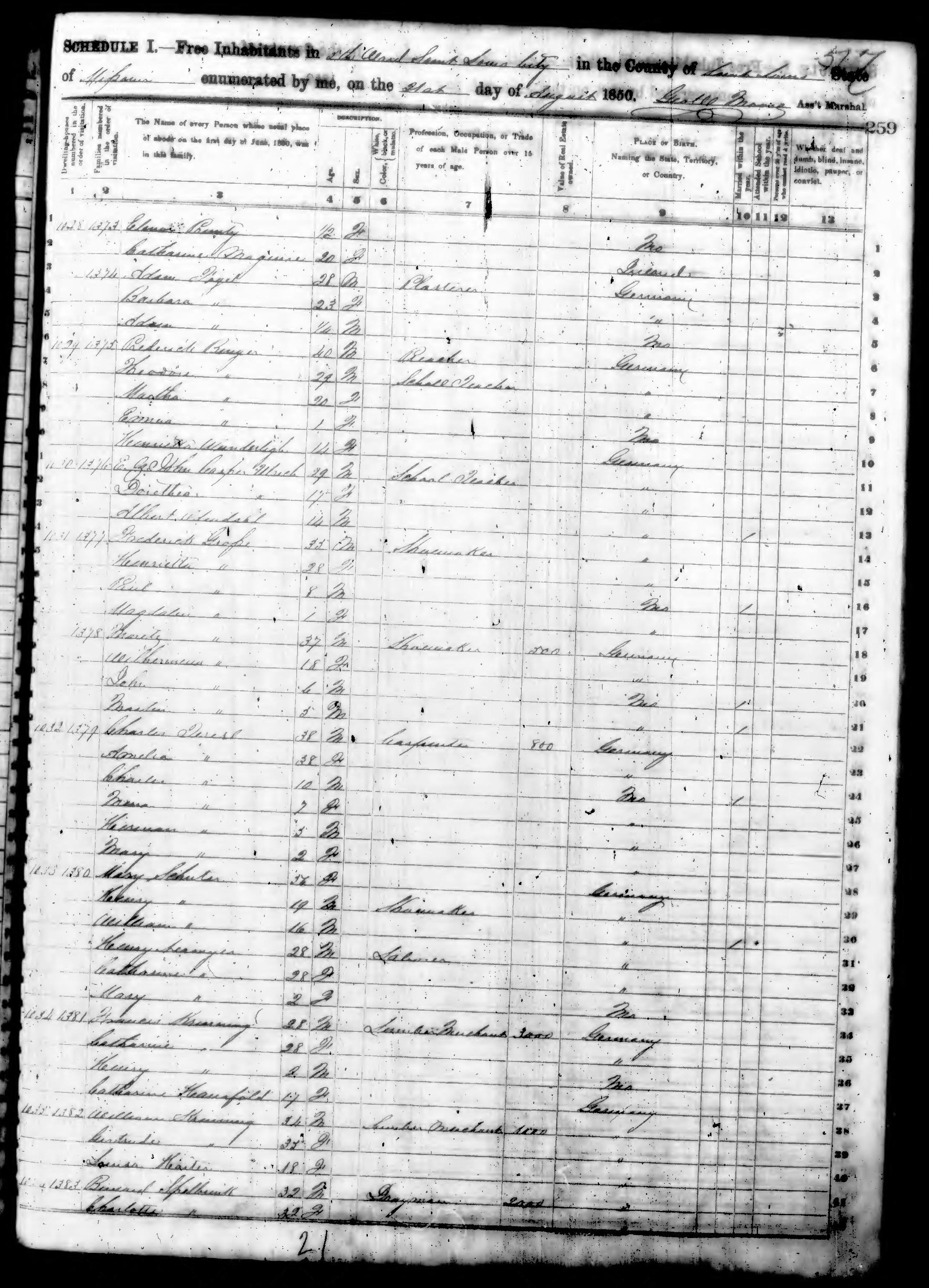 Ancestry.com Operations, Inc., 1850 United States Federal Census, Ward 5, Saint Louis City, MO, page 259, dwelling 1031, family 1378, line 19, Wilhermena Grosse; Database and images, Ancestry.com LLC, Ancestry.com : 2009 (http://www.Ancestry.com/ : accessed 05/05/2012); citing Seventh Census of the United States, 1850 U. S. Census, population schedules, National Archives and Records Administration Microfilm Publication M432 (1009 rolls), Records of the Census Bureau, Record Group 29, National Archives, Washington, DC, roll 417, image 520 [Surety: 3]. |