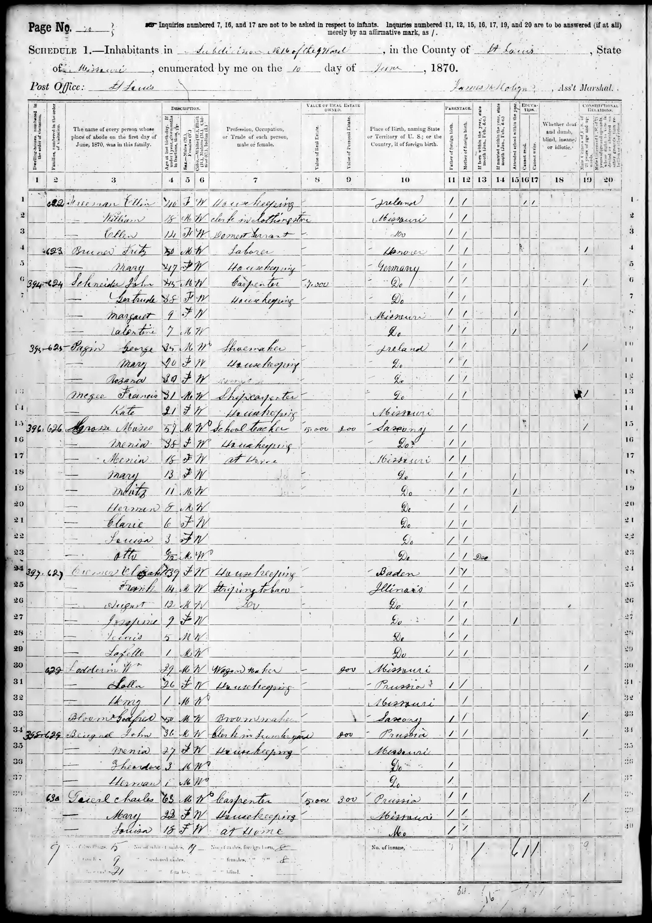 He appeared on the US Federal census on 06/01/1870 in St Louis, St Louis, Missouri with his family. [2] |