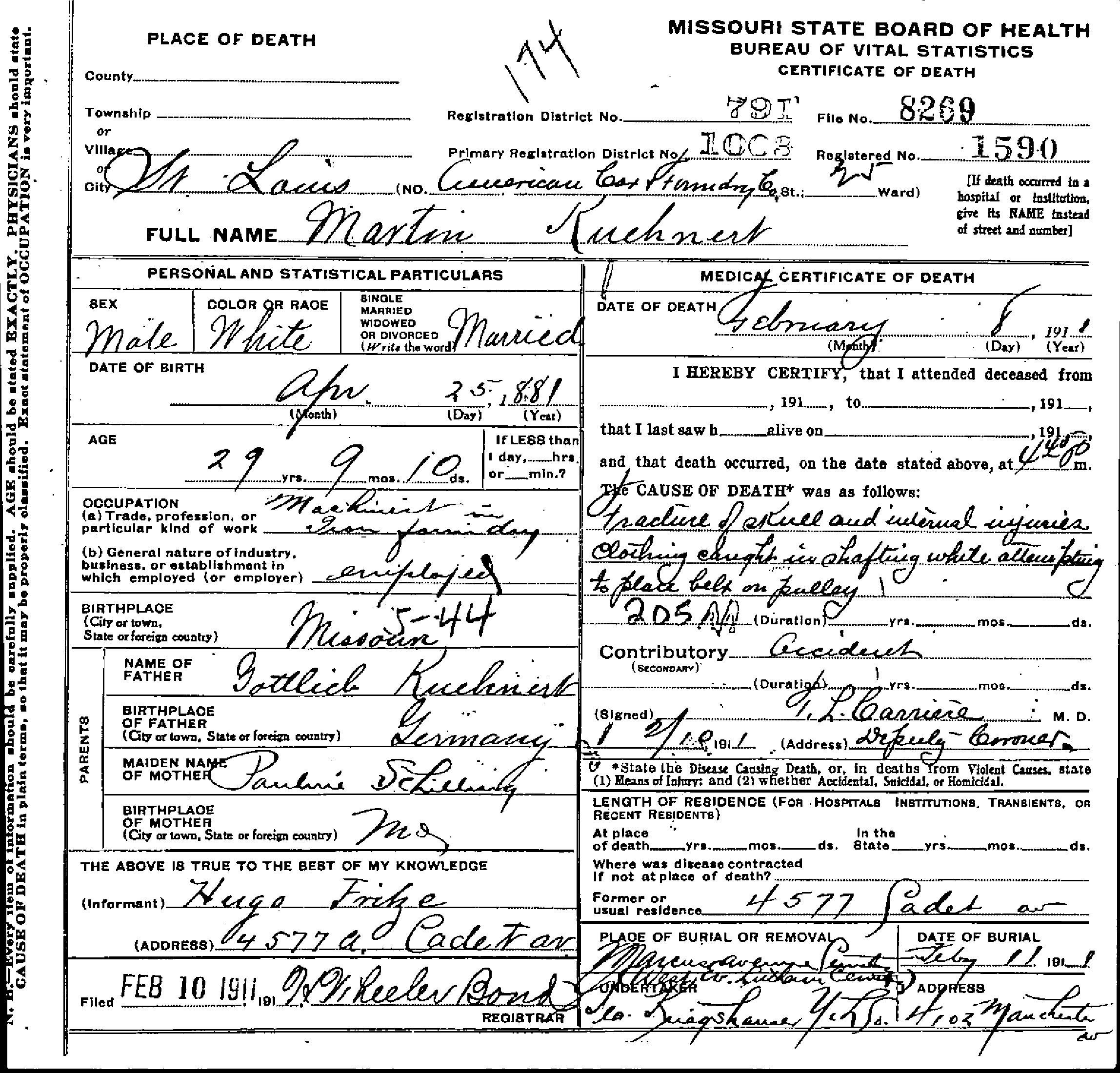 Ancestry.com Operations, Inc., Web: Missouri Death Certificates 1910-1962, St Louis City certificate 1911-8269, Martin Kuehnert; Database online, Ancestry.com LLC, Ancestry.com : 2015 (http://www.Ancestry.com/ : accessed 05/02/2012); citing Missouri Death Certificates, Missouri Secretary of State, Missouri Digital Heritage, Database and images [Surety: 3]. |