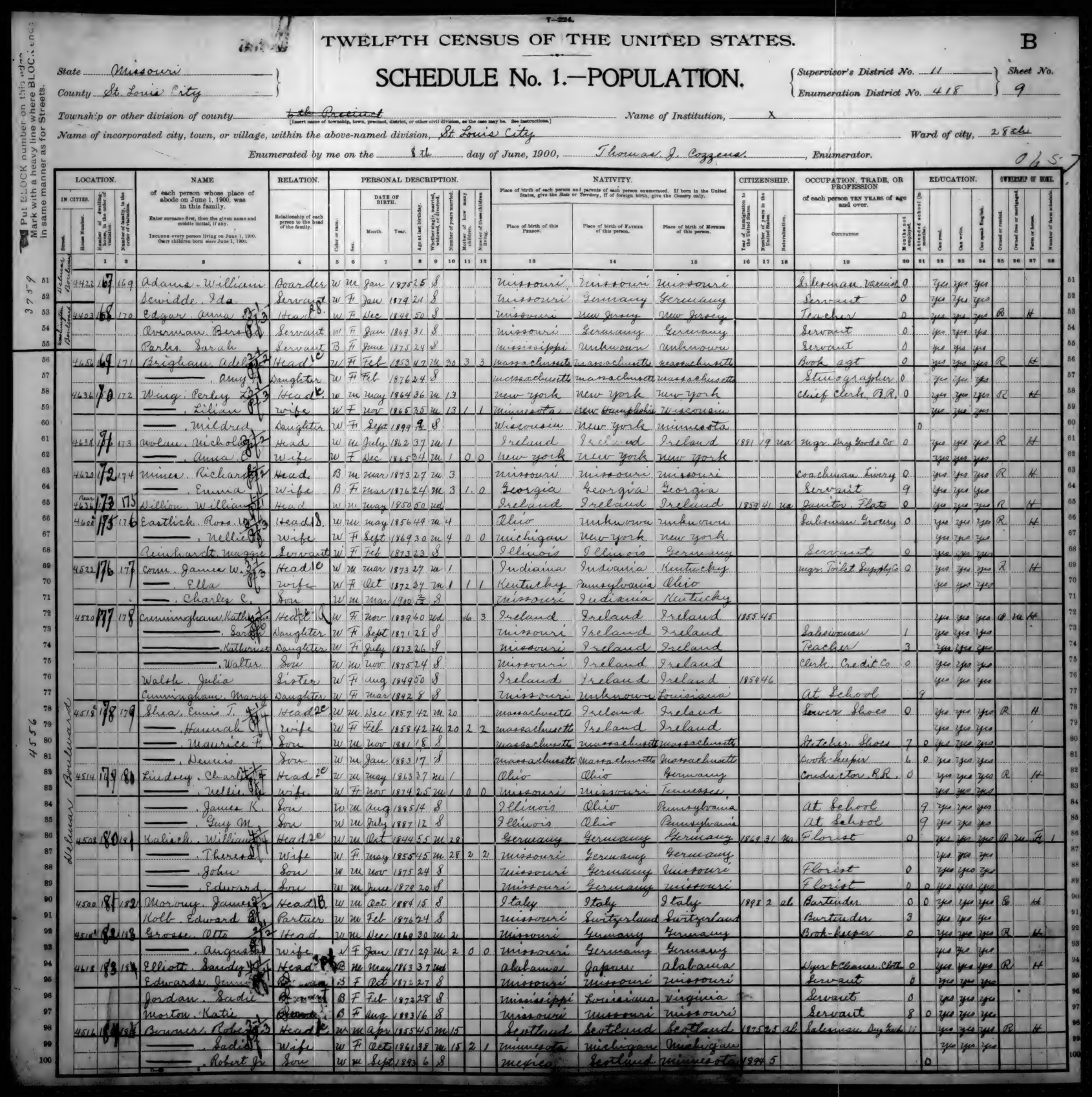 He appeared on the US Federal census on 06/01/1900 in St Louis City, Missouri with his wife. [4] |