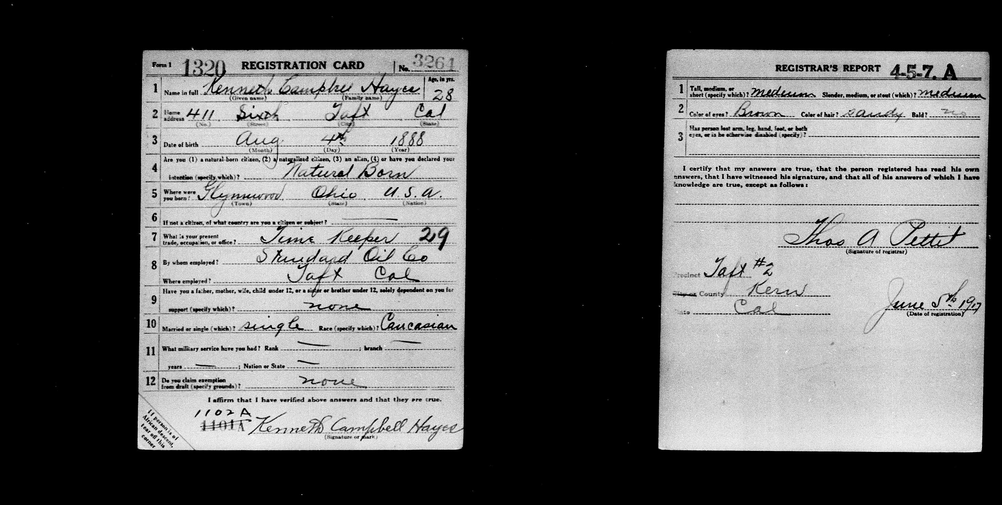 Ancestry.com Operations, Inc., U.S. World War I Draft Registration Cards, 1917-1918, Kenneth Campbell Hayes; Database and images, Ancestry.com LLC, Ancestry.com : 2005 (http://www.Ancestry.com/ : accessed 06/14/2012); citing National Archives and Records Administration, United States Selective Service System, "World War I Selective Service System Draft Registration Cards, 1917-1918," Washington, DC, Series M1509, 4,582 rolls [Surety: 3]. |