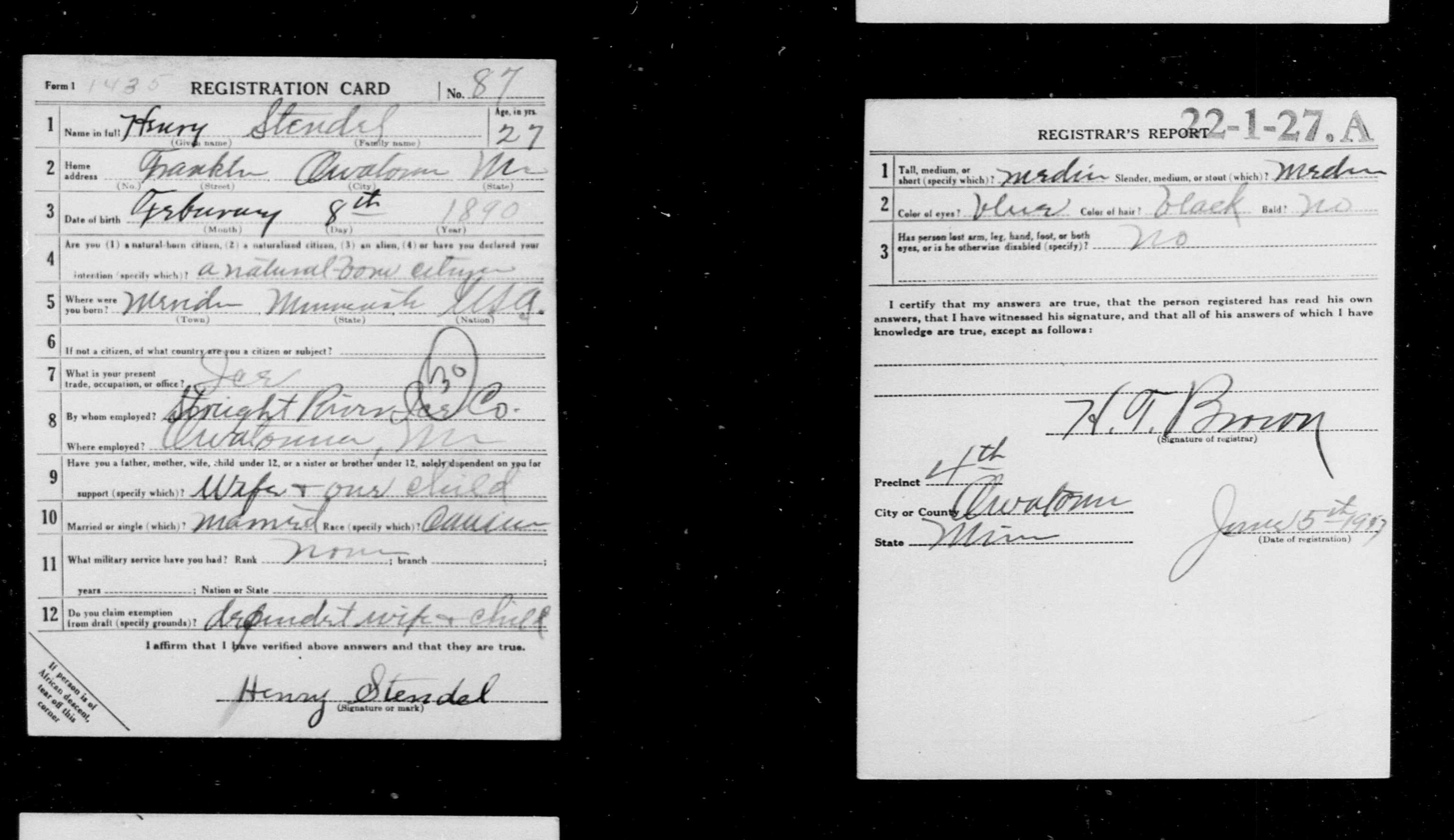 Ancestry.com Operations, Inc., U.S. World War I Draft Registration Cards, 1917-1918, Henry Standel; Database and images, Ancestry.com LLC, Ancestry.com : 2005 (http://www.Ancestry.com/ : accessed 01/11/2017); citing National Archives and Records Administration, United States Selective Service System, "World War I Selective Service System Draft Registration Cards, 1917-1918," Washington, DC, Series M1509, 4,582 rolls, FHL Microfilm 1,682,644 [Surety: 3]. |