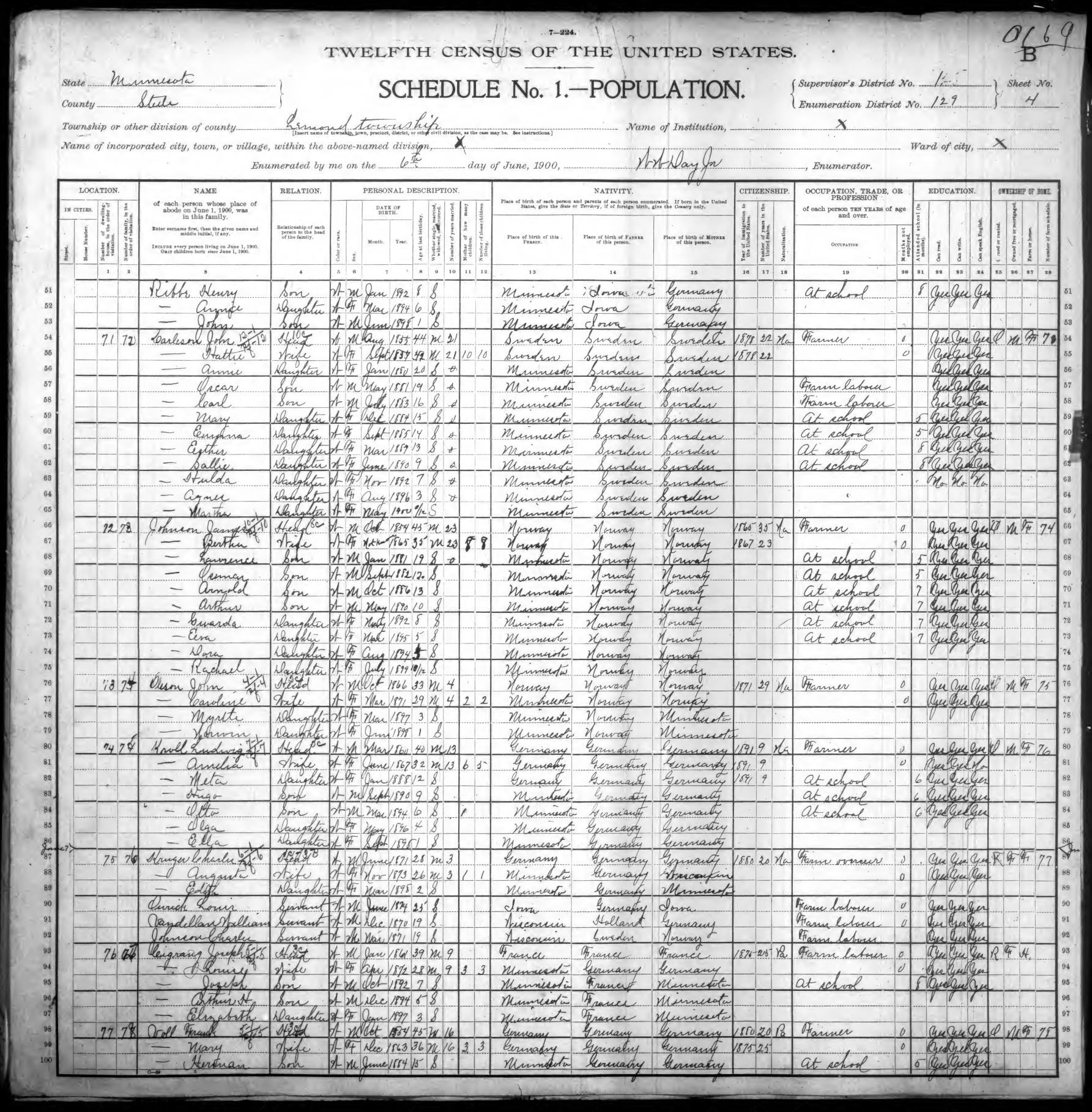 Ancestry.com Operations, Inc., 1900 United States Federal Census, ED 129, Lemond, Steele, MN, sheet 4B, dwelling 74, family 74, line 83, Kroll, Hugo; Database and images, Ancestry.com LLC, Ancestry.com : 2010 (http://www.Ancestry.com/ : accessed 02/19/2026); citing Twelth Census of the United States, 1900 U. S. Census, population schedules, National Archives and Records Administration Microfilm Publication T623 (1854 rolls), Records of the Bureau of the Census, Record Group 29, National Archives, Washington, DC, roll 793, image 139 [Surety: 3]. |