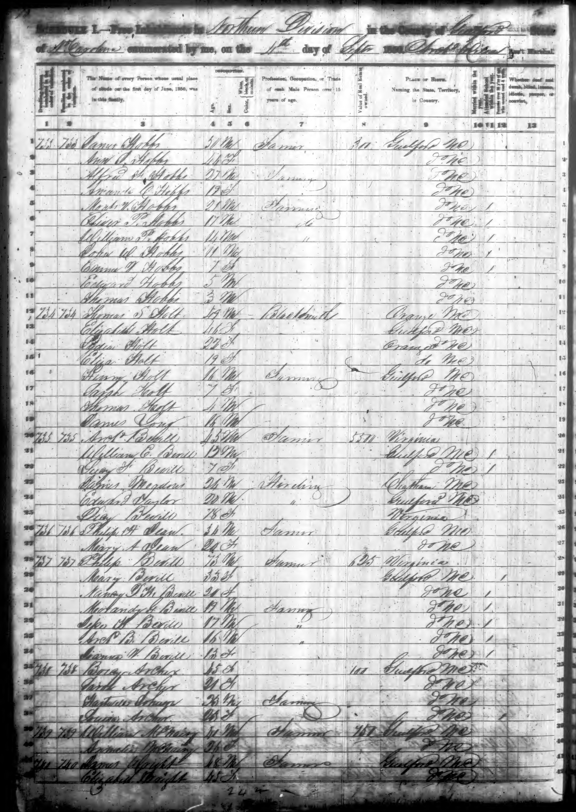 Ancestry.com Operations, Inc., 1860 United States Federal Census, North Division, Guilford, North Carolina, page 1, dwelling 1, family 1, line 1, Archibald Bevill; Database and images, Ancestry.com LLC, Ancestry.com : 2009 (http://www.Ancestry.com/ : accessed 12/21/2025); citing Eighth Census of the United States, 1860 U. S. Census, population schedules, National Archives and Records Administration Microfilm Publication M653 (1438 rolls), Records of the Census Bureau, Record Group 29, National Archives, Washington, DC, roll 900, image 244 [Surety: 3]. |