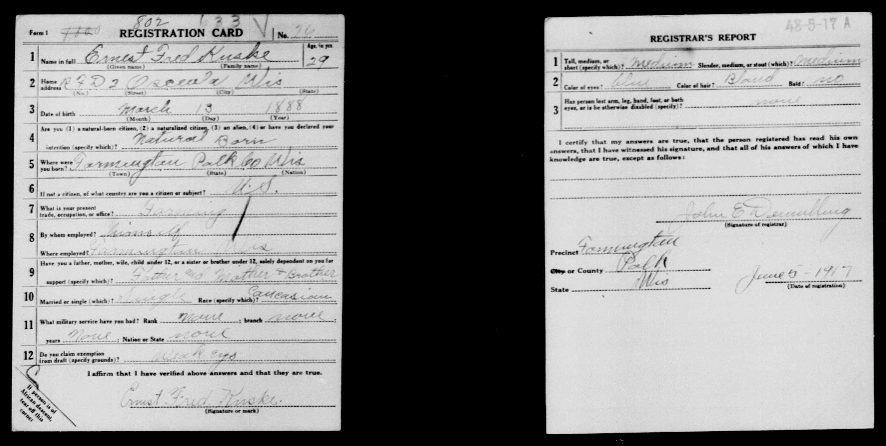 Ancestry.com Operations, Inc., U.S. World War I Draft Registration Cards, 1917-1918, Ernest Fred Kuske; Database and images, Ancestry.com LLC, Ancestry.com : 2005 (http://www.Ancestry.com/ : accessed 09/05/2012); citing National Archives and Records Administration, United States Selective Service System, "World War I Selective Service System Draft Registration Cards, 1917-1918," Washington, DC, Series M1509, 4,582 rolls, FHL Microfilm 1,674,884 [Surety: 3]. |