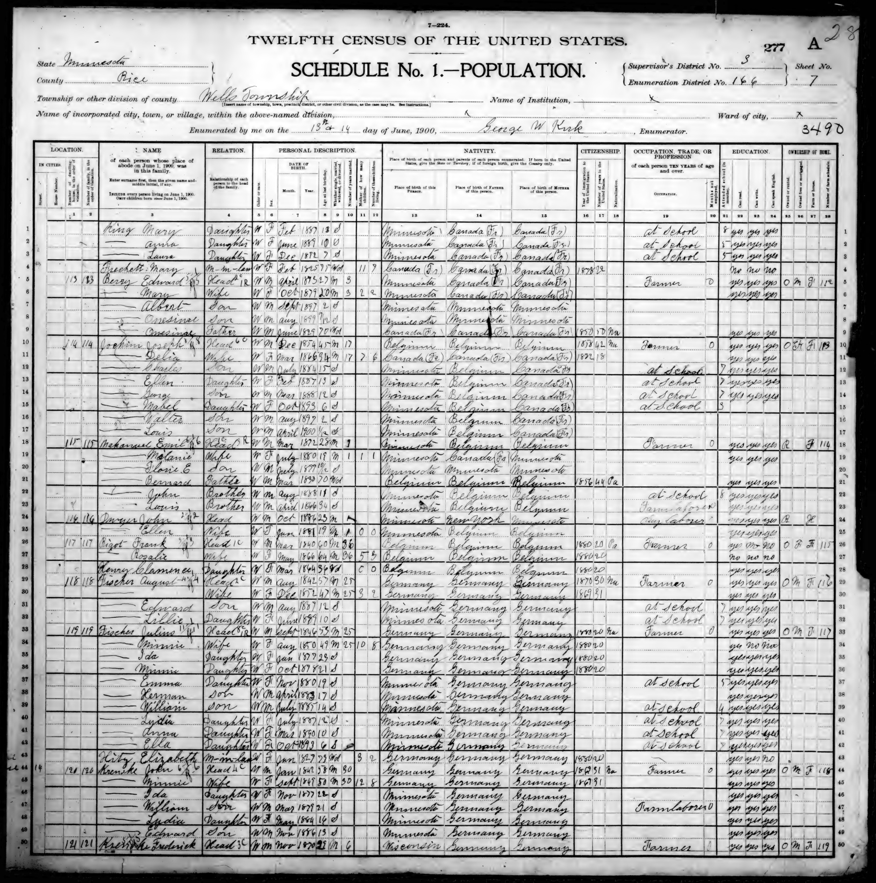 Ancestry.com Operations, Inc., 1900 United States Federal Census, ED 166, Wells, Rice, MN, sheet 7A, dwelling 112, family 112, line 3, King, Laura; Database and images, Ancestry.com LLC, Ancestry.com : 2010 (http://www.Ancestry.com/ : accessed 02/20/2026); citing Twelth Census of the United States, 1900 U. S. Census, population schedules, National Archives and Records Administration Microfilm Publication T623 (1854 rolls), Records of the Bureau of the Census, Record Group 29, National Archives, Washington, DC, roll 788, image 563 [Surety: 3]. |
