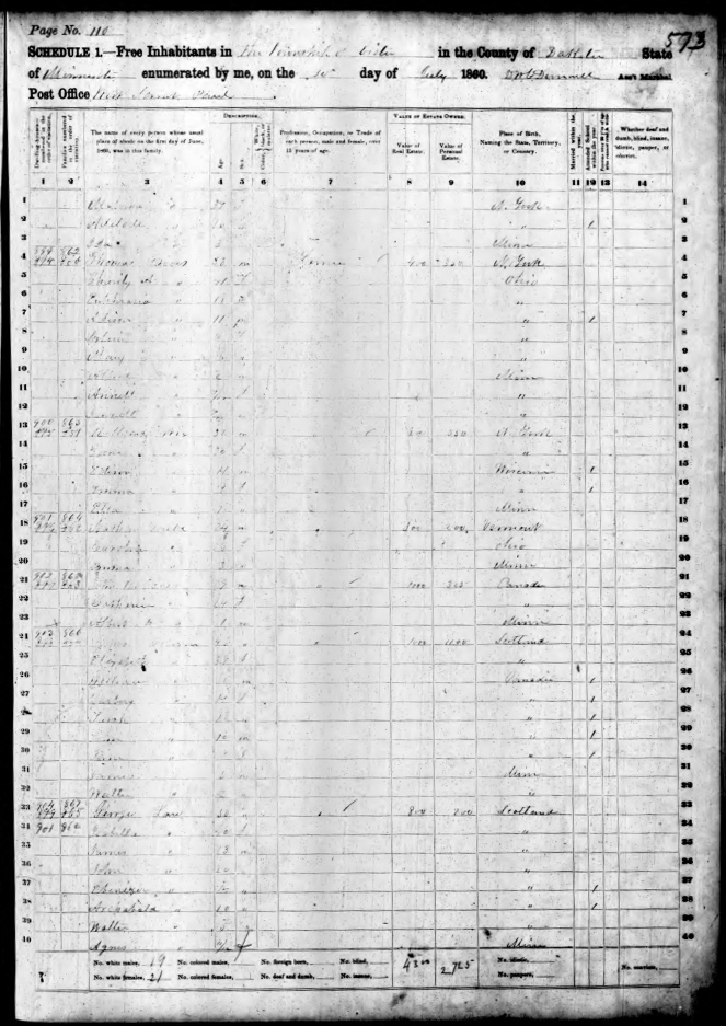 Ancestry.com Operations, Inc., 1860 United States Federal Census, Sciota, Dakota, MN, page 110, dwelling 904, family 867, line 39, Walter Law; Database and images, Ancestry.com LLC, Ancestry.com : 2009 (http://www.Ancestry.com/ : accessed 11/19/2019); citing Eighth Census of the United States, 1860 U. S. Census, population schedules, National Archives and Records Administration Microfilm Publication M653 (1438 rolls), Records of the Census Bureau, Record Group 29, National Archives, Washington, DC, roll 568, image 115 [Surety: 3]. |
