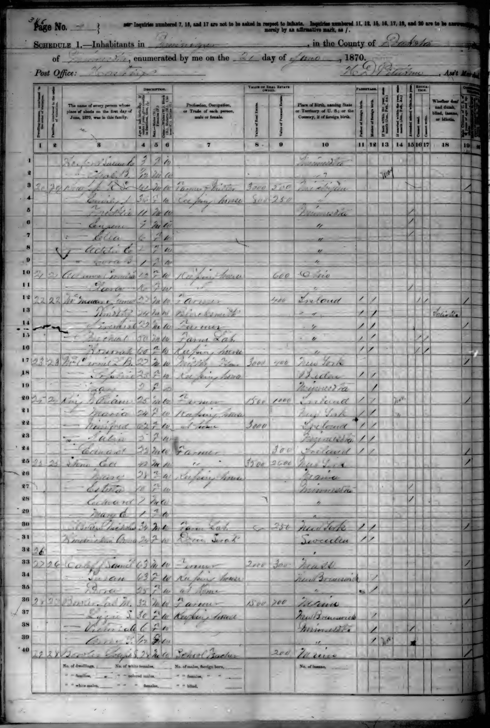 Ancestry.com Operations, Inc., 1870 United States Census, Nininger, Dakota, MN, page 4, dwelling 28, family 27, line 38, Bowler, Victoria M; Database and images, Ancestry.com LLC, Ancestry.com : 2009 (http://www.Ancestry.com/ : accessed 11/28/2022); citing Ninth Census of the United States, 1870 U. S. Census, population schedules, National Archives and Records Administration Microfilm Publication M593 (1761 rolls), Records of the Bureau of the Census, Record Group 29, National Archives, Washington, DC, roll 2, image 580 [Surety: 3]. |