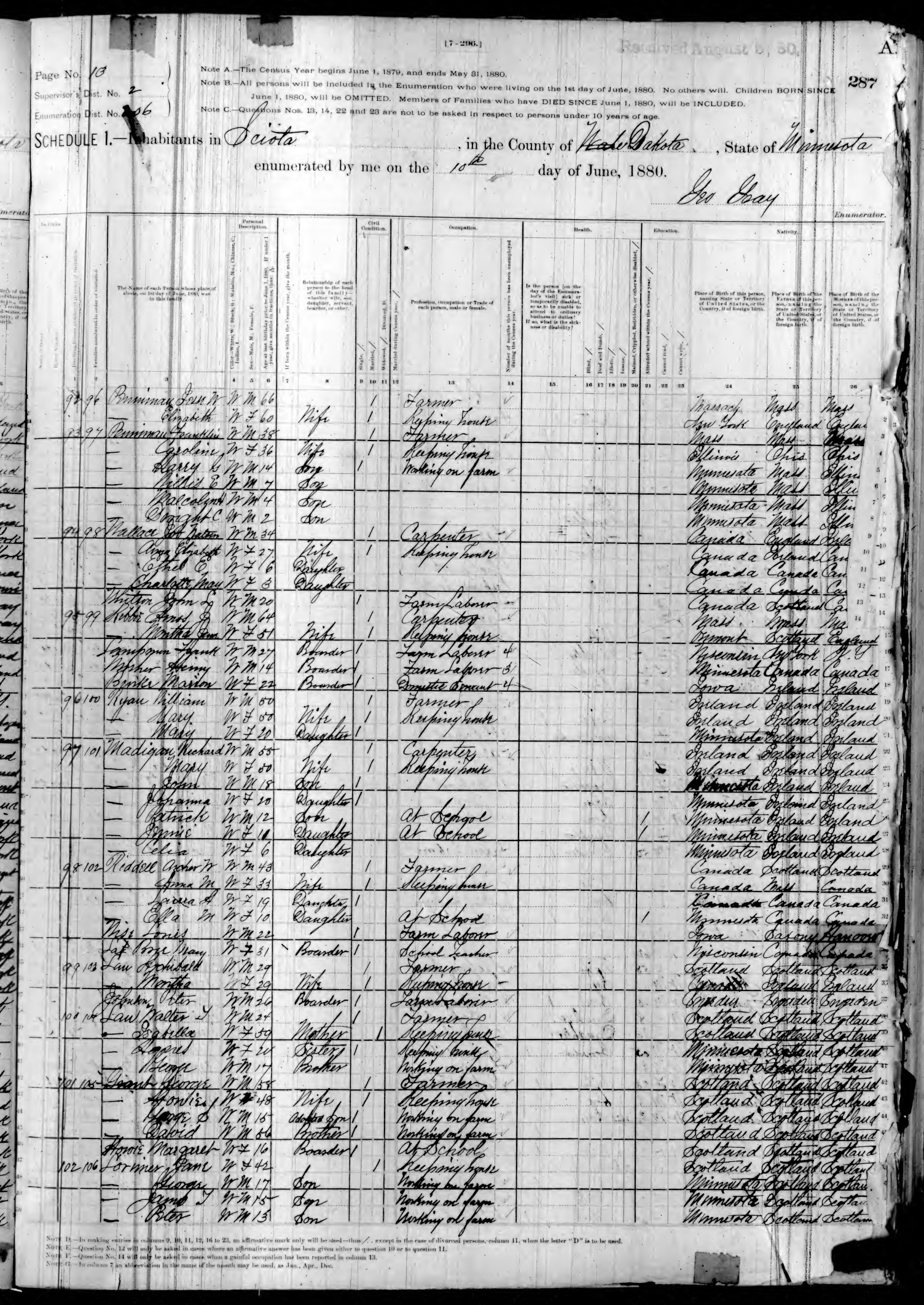 Ancestry.com Operations, Inc., 1880 United States Federal Census, ED 206, Sciota, Dakota, MN, page 13, dwelling 100, family 104, line 38, Law Walter T; Database and images, Ancestry.com LLC, Ancestry.com : 2010 (http://www.Ancestry.com/ : accessed 10/07/2025); citing Tenth Census of the United States, 1880 U. S. Census, population schedules, National Archives and Records Administration Microfilm Publication T9 (1454 rolls), Records of the Bureau of the Census, Record Group 29, National Archives, Washington, DC, roll 618, image 258 [Surety: 3]. |