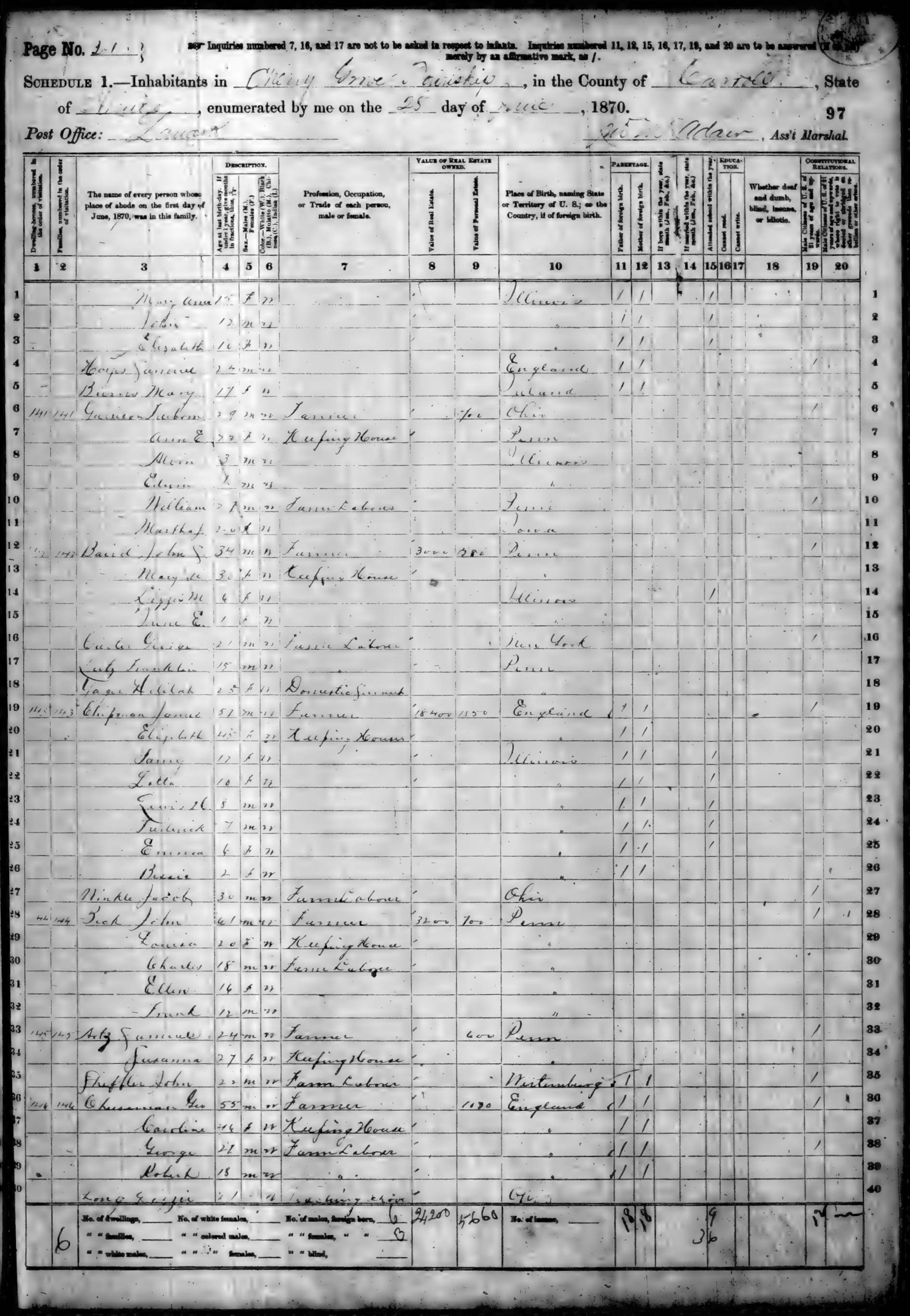 Ancestry.com Operations, Inc., 1870 United States Census, Cherry Grove, Carroll, IL, page 21, dwelling 143, family 143, line 25, Chipman, Emma; Database and images, Ancestry.com LLC, Ancestry.com : 2009 (http://www.Ancestry.com/ : accessed 04/06/2022); citing Ninth Census of the United States, 1870 U. S. Census, population schedules, National Archives and Records Administration Microfilm Publication M593 (1761 rolls), Records of the Bureau of the Census, Record Group 29, National Archives, Washington, DC, roll 191, image 199 [Surety: 3]. |