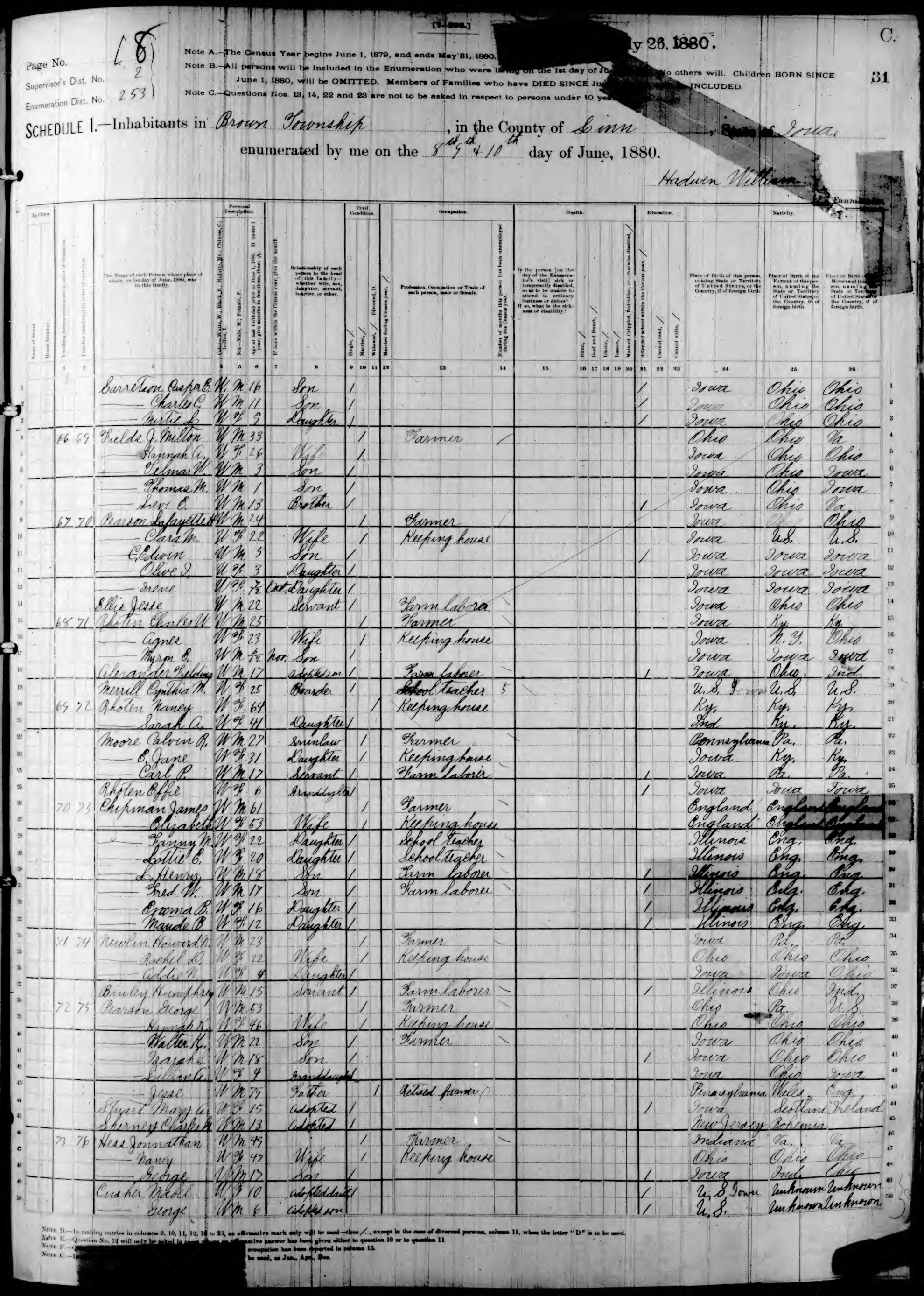 Ancestry.com Operations, Inc., 1880 United States Federal Census, ED 253, Brown, Linn, IA, page 18, dwelling 70, family 73, line 32, Chipman, Emma B; Database and images, Ancestry.com LLC, Ancestry.com : 2010 (http://www.Ancestry.com/ : accessed 04/08/2022); citing Tenth Census of the United States, 1880 U. S. Census, population schedules, National Archives and Records Administration Microfilm Publication T9 (1454 rolls), Records of the Bureau of the Census, Record Group 29, National Archives, Washington, DC, roll 351, image 66 [Surety: 3]. |