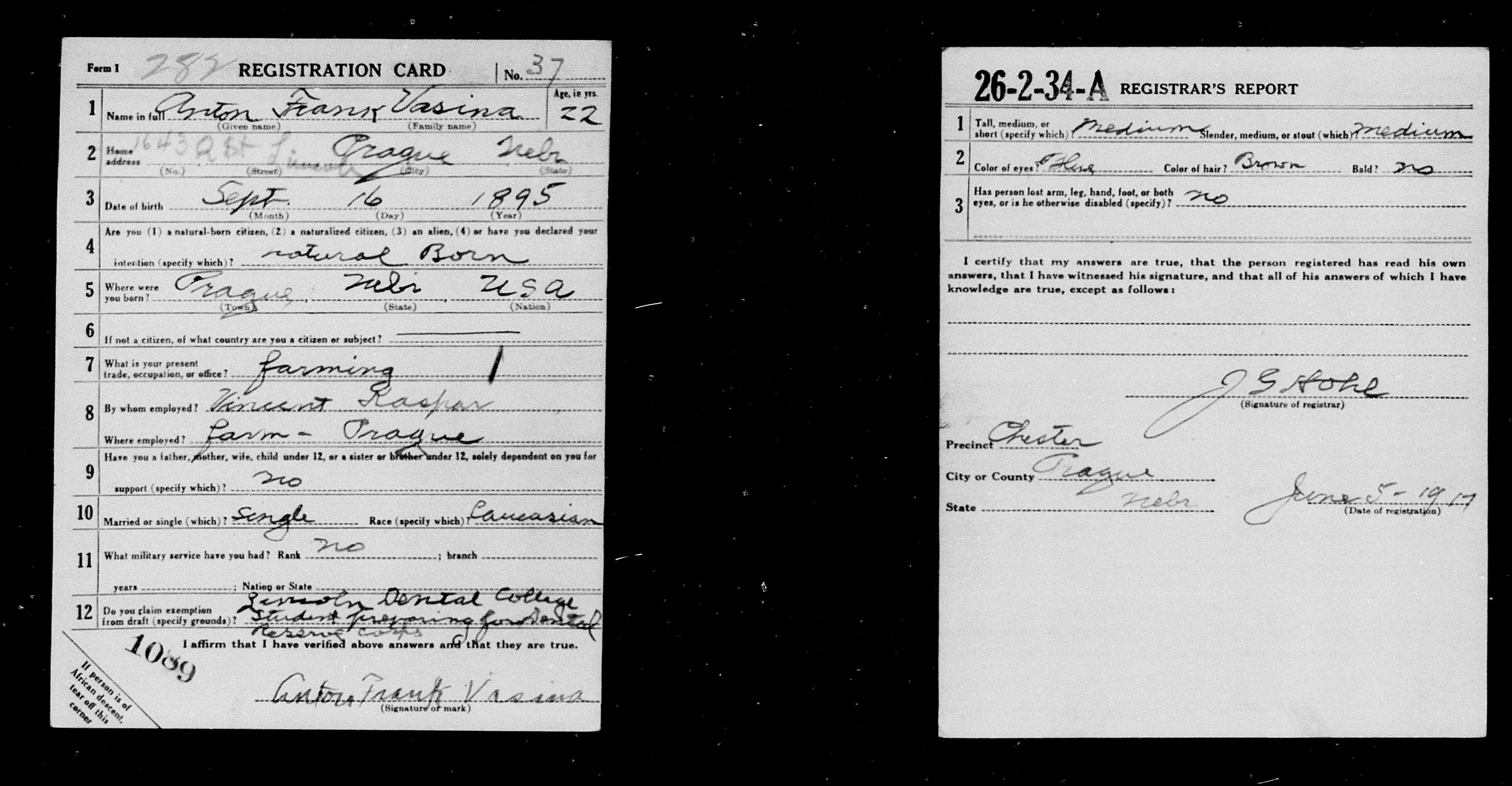 He registered for the Draft for World War I on 06/05/1917 in Prague, Saunders, Nebraska . [2] |