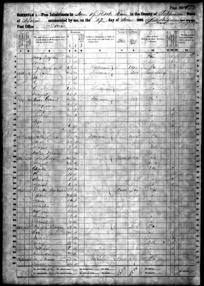 Ancestry.com Operations, Inc., 1860 United States Federal Census, Rock Run, Stephenson, IL, page 355, dwelling 2692, family 2573, line 3, William Shane; Database and images, Ancestry.com LLC, Ancestry.com : 2009 (http://www.Ancestry.com/ : accessed 03/12/2020); citing Eighth Census of the United States, 1860 U. S. Census, population schedules, National Archives and Records Administration Microfilm Publication M653 (1438 rolls), Records of the Census Bureau, Record Group 29, National Archives, Washington, DC, roll 230, image 357 [Surety: 3]. |