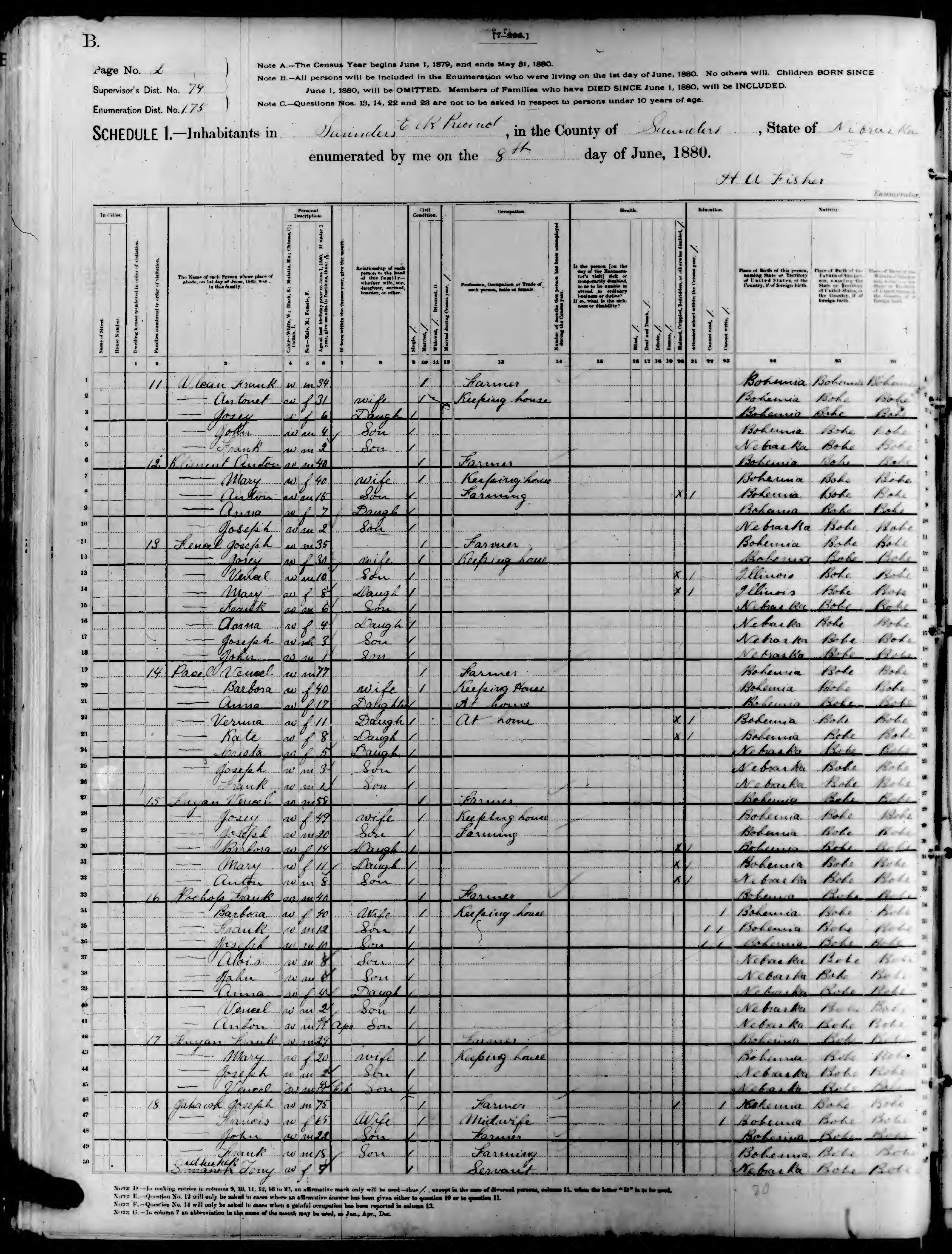 Ancestry.com Operations, Inc., 1880 United States Federal Census, ED 175, Elk, Saunders, NE, page 2B, dwelling 15, family 15, line 32, Fuyan, Anton; Database and images, Ancestry.com LLC, Ancestry.com : 2010 (http://www.Ancestry.com/ : accessed 03/11/2014); citing Tenth Census of the United States, 1880 U. S. Census, population schedules, National Archives and Records Administration Microfilm Publication T9 (1454 rolls), Records of the Bureau of the Census, Record Group 29, National Archives, Washington, DC, roll 755, image 611 [Surety: 3]. |