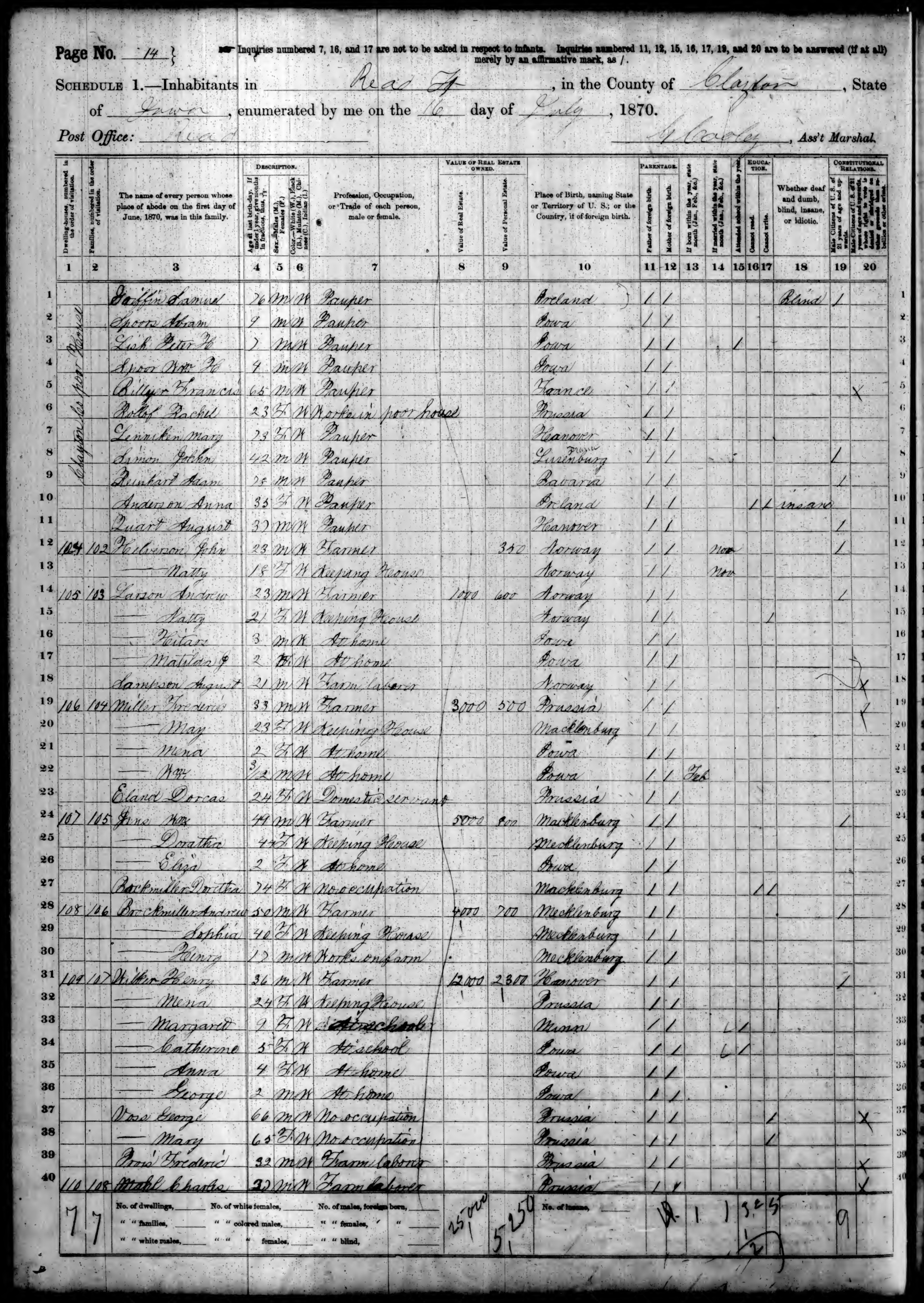Ancestry.com Operations, Inc., 1870 United States Census, Read, Clayton, IA, page 14, dwelling 107, family 105, line 26, Jans, Eliza; Database and images, Ancestry.com LLC, Ancestry.com : 2009 (http://www.Ancestry.com/ : accessed 11/18/2022); citing Ninth Census of the United States, 1870 U. S. Census, population schedules, National Archives and Records Administration Microfilm Publication M593 (1761 rolls), Records of the Bureau of the Census, Record Group 29, National Archives, Washington, DC, roll 383, image 632 [Surety: 3]. |
