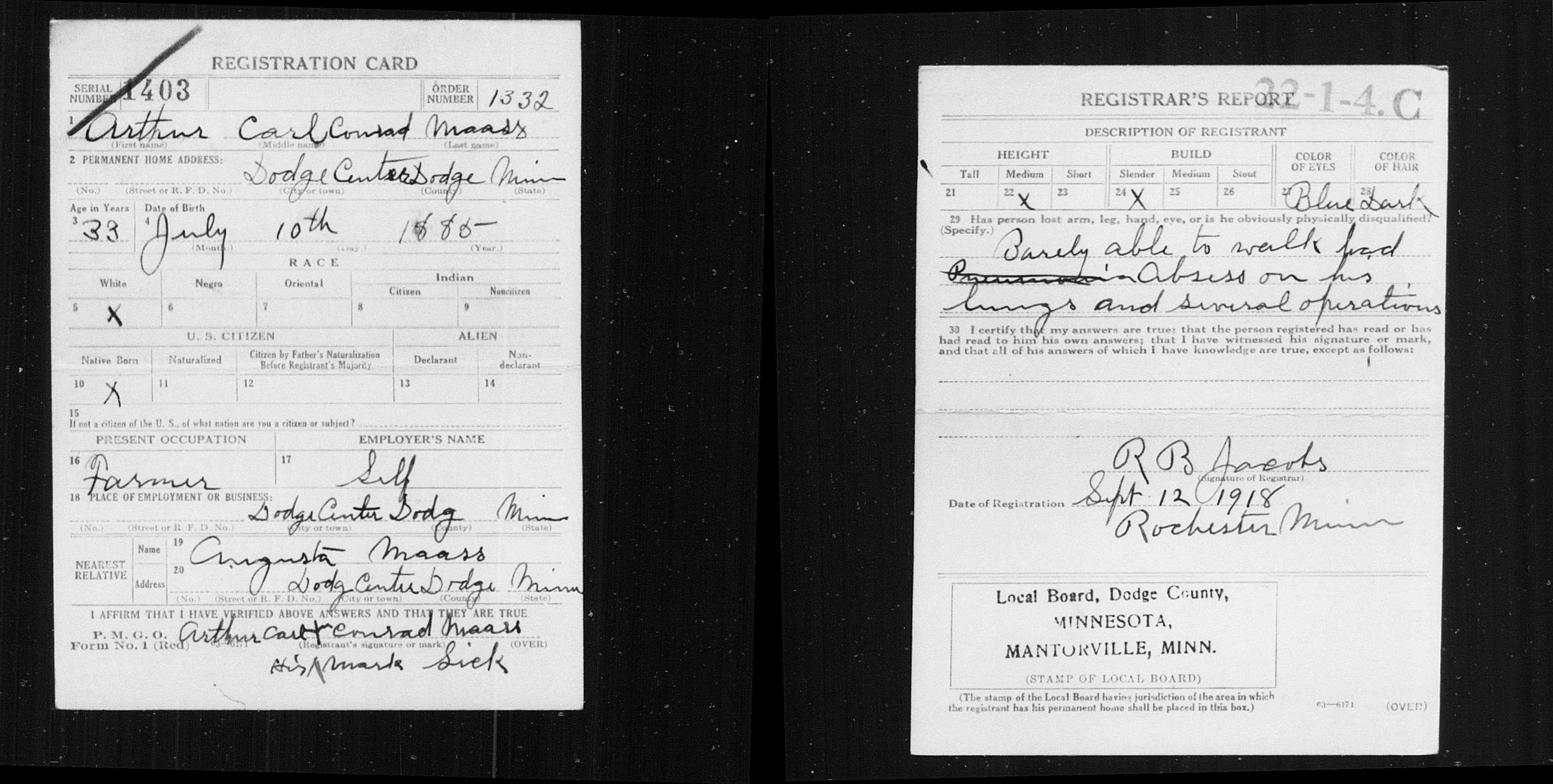 Ancestry.com Operations, Inc., U.S. World War I Draft Registration Cards, 1917-1918, Arthur Carl Conrad Maass; Database and images, Ancestry.com LLC, Ancestry.com : 2005 (http://www.Ancestry.com/ : accessed 09/04/2015); citing National Archives and Records Administration, United States Selective Service System, "World War I Selective Service System Draft Registration Cards, 1917-1918," Washington, DC, Series M1509, 4,582 rolls, FHL Microfilm 1,675,392 [Surety: 3]. |