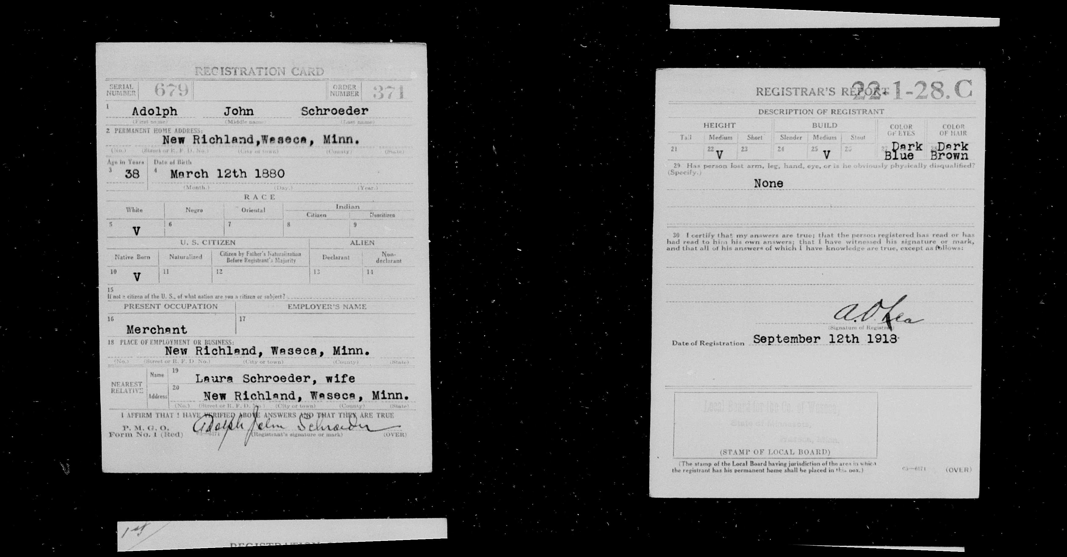 He registered for the Draft for World War I on 09/12/1918 in Waseca County, Minnesota . [9] |