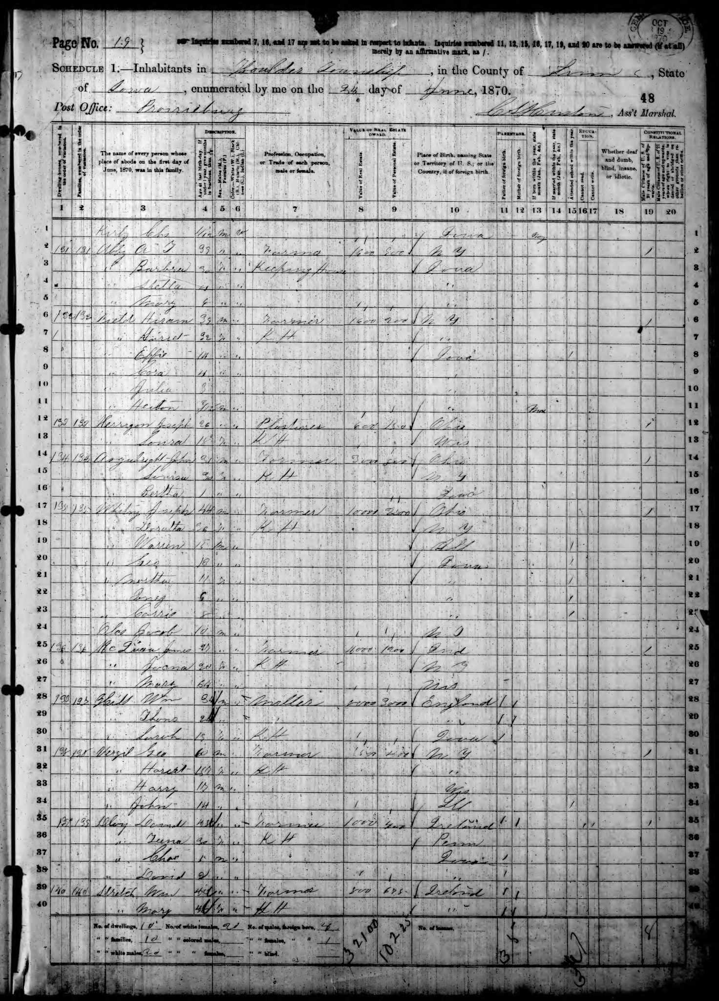 Ancestry.com Operations, Inc., 1870 United States Census, Boulder, Linn, IA, page 19, dwelling 140, family 140, line 39, Stretch, Wm; Database and images, Ancestry.com LLC, Ancestry.com : 2009 (http://www.Ancestry.com/ : accessed 12/24/2025); citing Ninth Census of the United States, 1870 U. S. Census, population schedules, National Archives and Records Administration Microfilm Publication M593 (1761 rolls), Records of the Bureau of the Census, Record Group 29, National Archives, Washington, DC, roll 405, image 47 [Surety: 3]. |