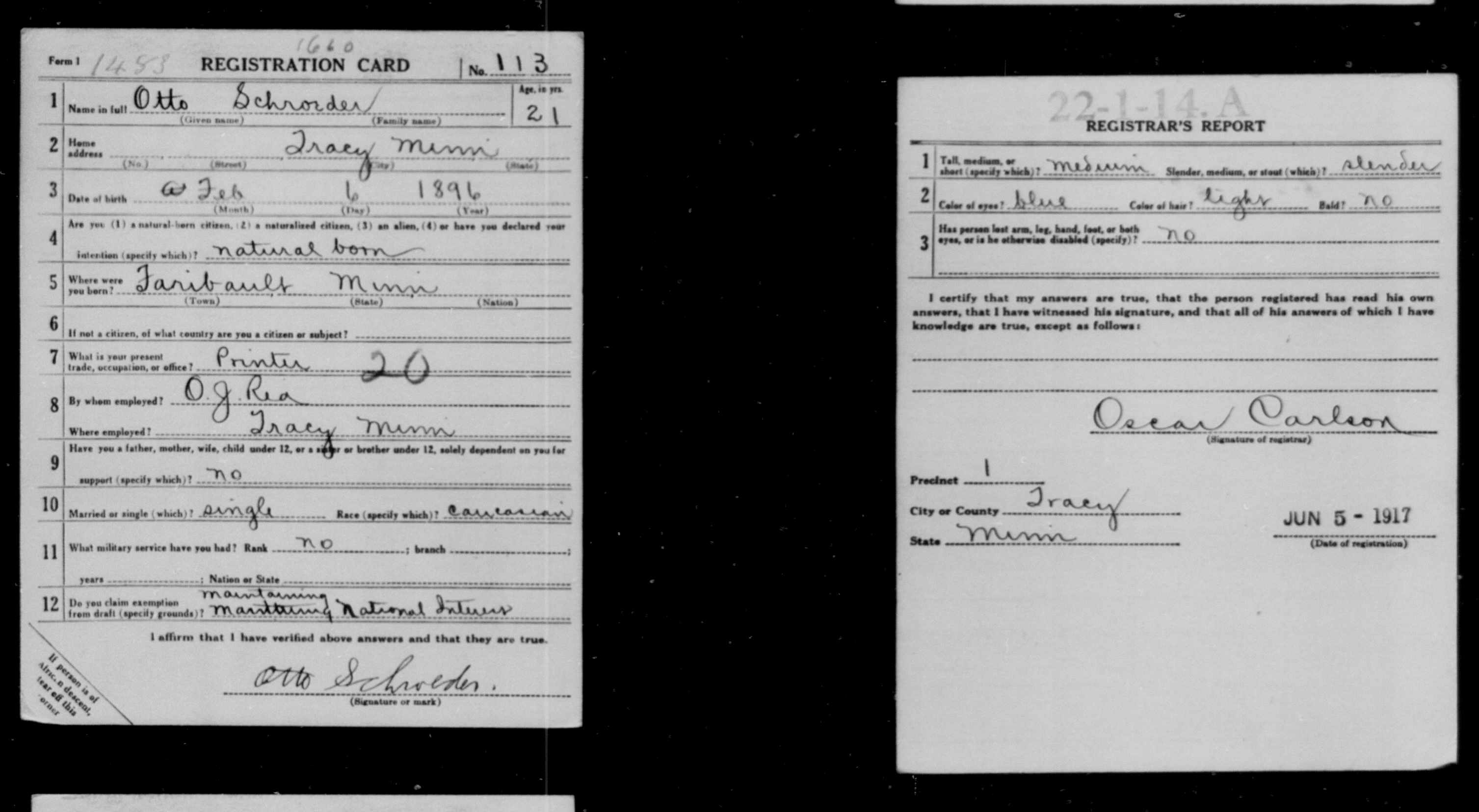He was described as of medium height and slender build with blue eyes and light hair on 06/05/1917 in Tracy, Lyon, Minnesota . [4] |