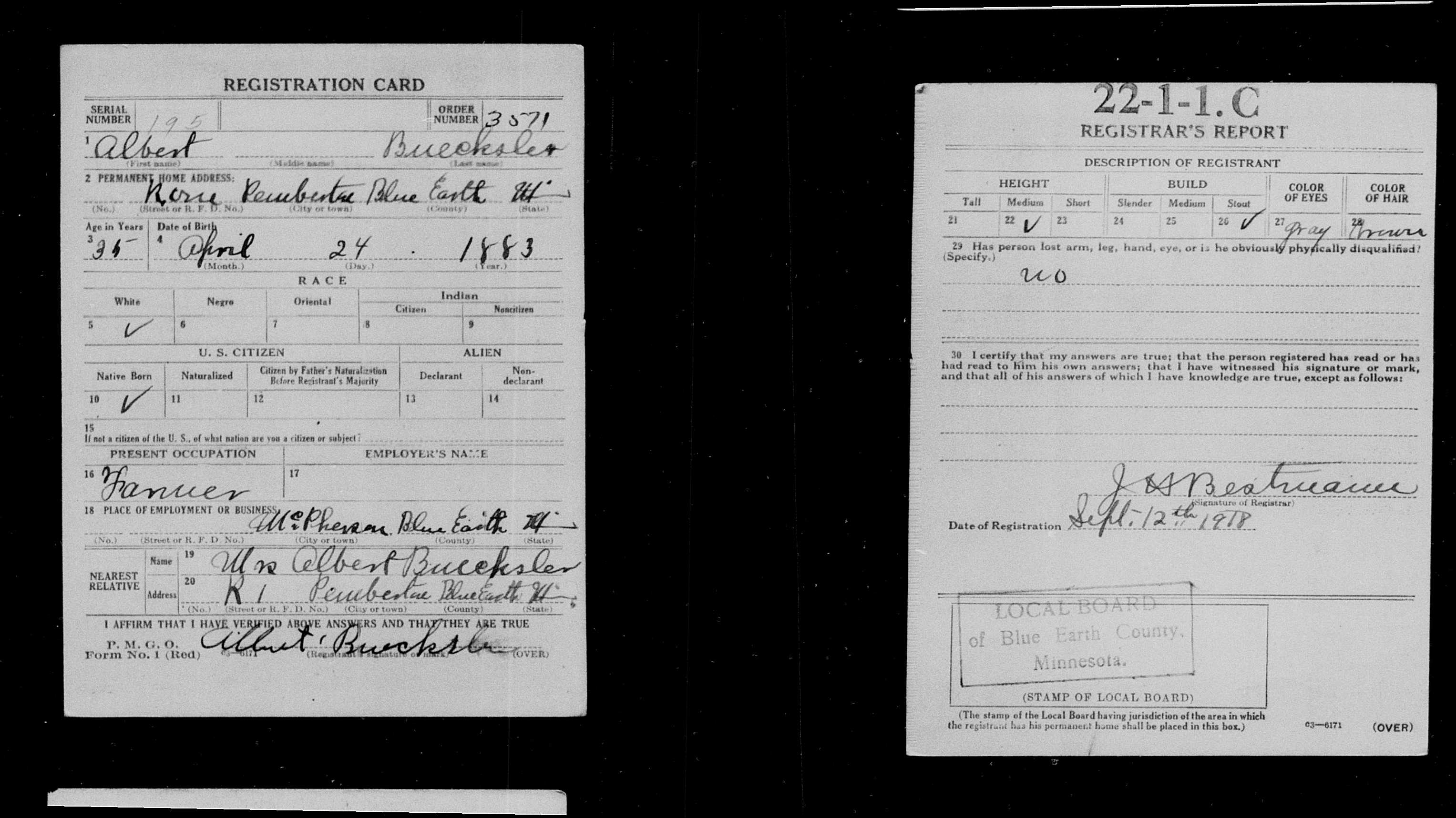 Ancestry.com Operations, Inc., U.S. World War I Draft Registration Cards, 1917-1918, Albert Buecksler; Database and images, Ancestry.com LLC, Ancestry.com : 2005 (http://www.Ancestry.com/ : accessed 12/13/2015); citing National Archives and Records Administration, United States Selective Service System, "World War I Selective Service System Draft Registration Cards, 1917-1918," Washington, DC, Series M1509, 4,582 rolls [Surety: 3]. |