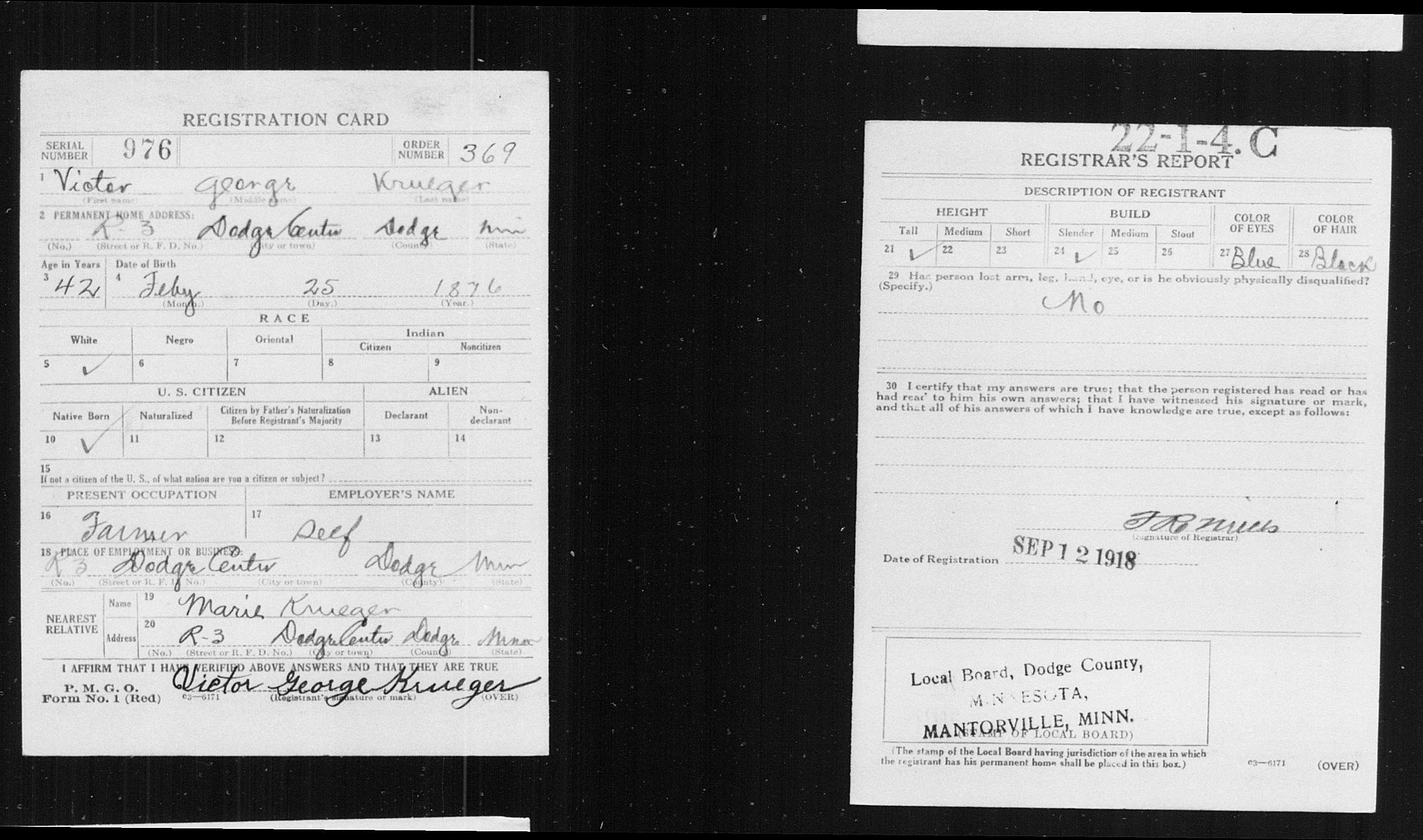 Ancestry.com Operations, Inc., U.S. World War I Draft Registration Cards, 1917-1918, Victor George Krueger; Database and images, Ancestry.com LLC, Ancestry.com : 2005 (http://www.Ancestry.com/ : accessed 09/10/2015); citing National Archives and Records Administration, United States Selective Service System, "World War I Selective Service System Draft Registration Cards, 1917-1918," Washington, DC, Series M1509, 4,582 rolls, FHL Microfilm 1,675,392 [Surety: 3]. |