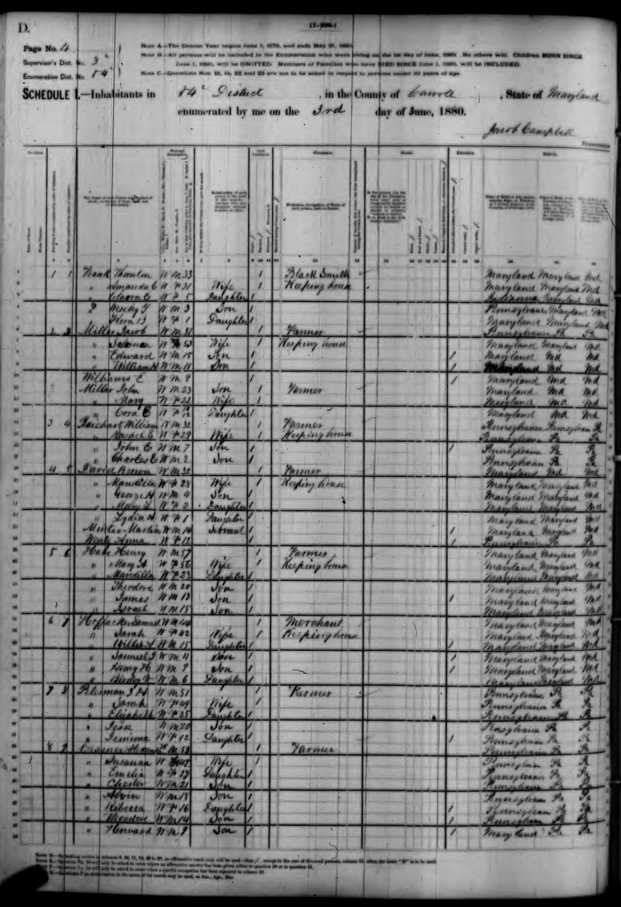 Ancestry.com Operations, Inc., 1880 United States Federal Census, ED 54, District 54, Carroll County, MD, page 4D, dwelling 3, family 4, line 15, Reichart, John E; Database and images, Ancestry.com LLC, Ancestry.com : 2010 (http://www.Ancestry.com/ : accessed 04/12/2016); citing Tenth Census of the United States, 1880 U. S. Census, population schedules, National Archives and Records Administration Microfilm Publication T9 (1454 rolls), Records of the Bureau of the Census, Record Group 29, National Archives, Washington, DC, roll 506, image 562 [Surety: 3]. |