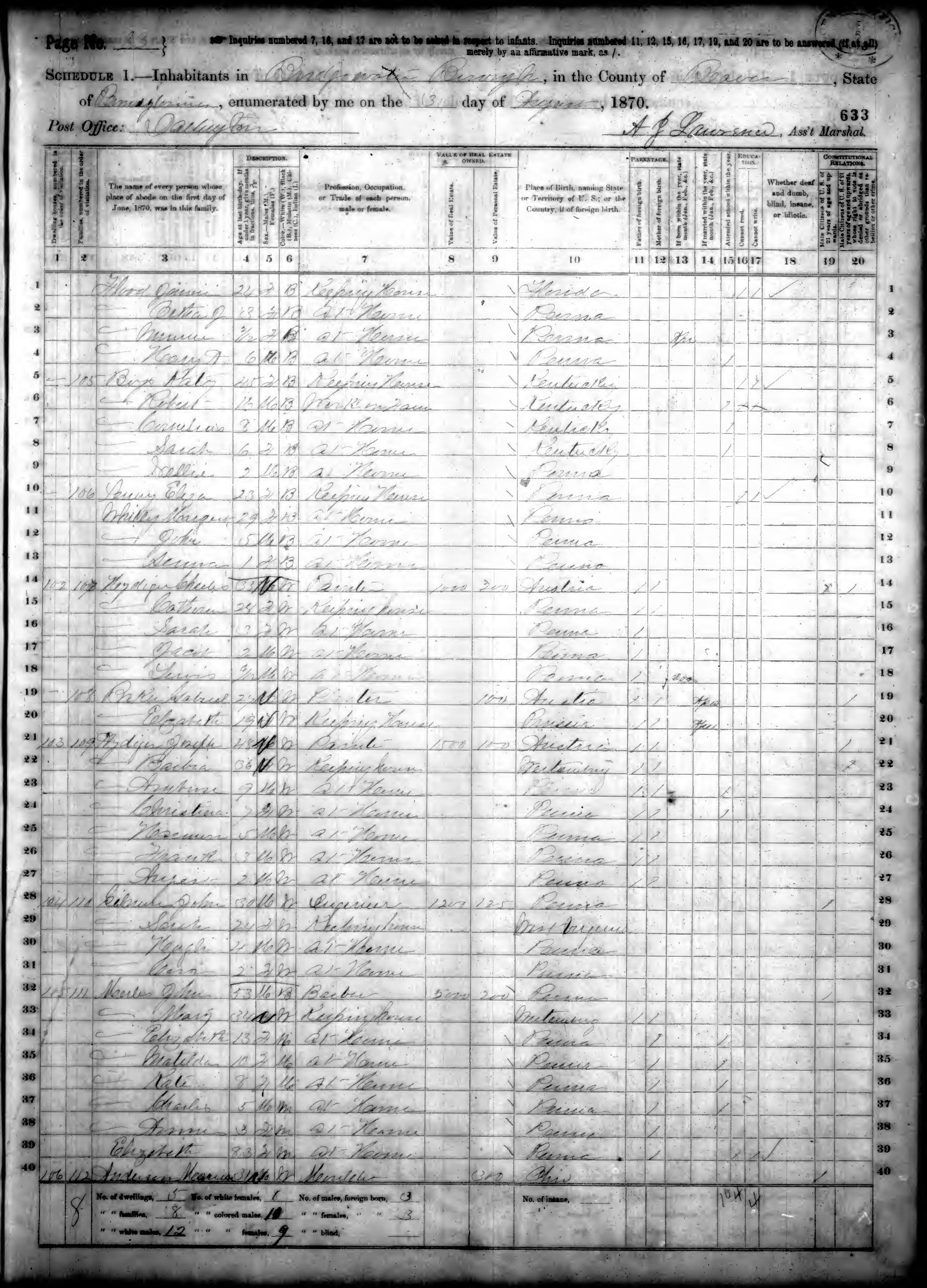 Ancestry.com Operations, Inc., 1870 United States Census, Bridgewater, Beaver, PA, page 13, dwelling 102, family 107, line 16, Hydiger, Sarah; Database and images, Ancestry.com LLC, Ancestry.com : 2009 (http://www.Ancestry.com/ : accessed 05/14/2016); citing Ninth Census of the United States, 1870 U. S. Census, population schedules, National Archives and Records Administration Microfilm Publication M593 (1761 rolls), Records of the Bureau of the Census, Record Group 29, National Archives, Washington, DC, roll 1302, image 124 [Surety: 3]. |