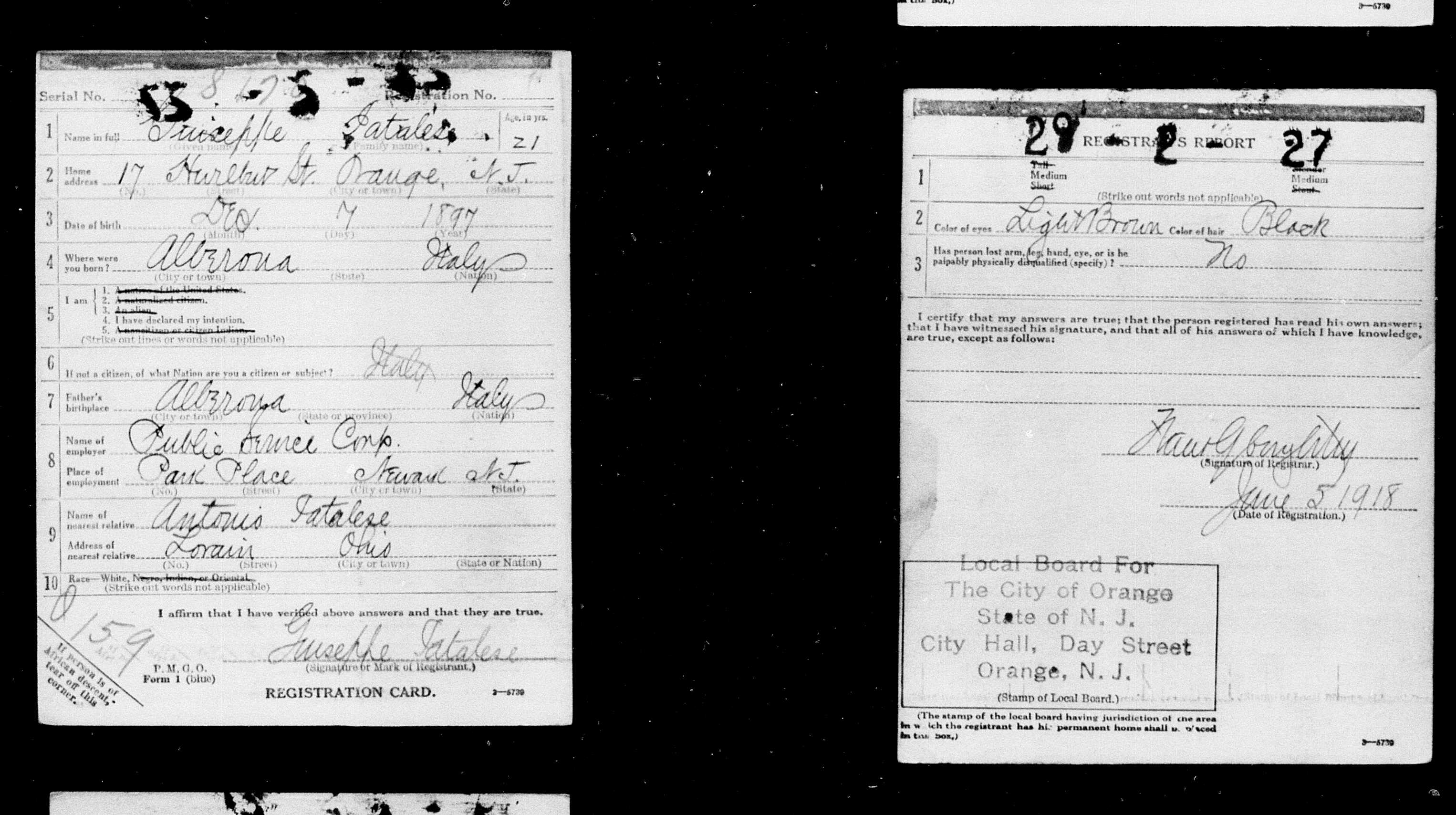 Ancestry.com Operations, Inc., U.S. World War I Draft Registration Cards, 1917-1918, Guiseppe Iatalese; Database and images, Ancestry.com LLC, Ancestry.com : 2005 (http://www.Ancestry.com/ : accessed 04/18/2016); citing National Archives and Records Administration, United States Selective Service System, "World War I Selective Service System Draft Registration Cards, 1917-1918," Washington, DC, Series M1509, 4,582 rolls, FHL Microfilm 1,754,353 [Surety: 3]. |