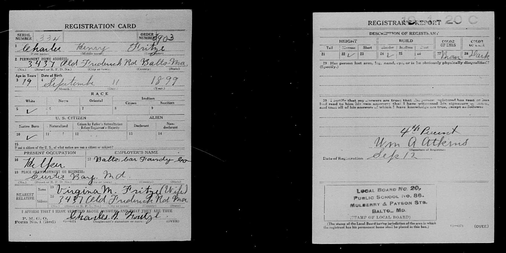 | 4. | He registered for the Draft for World War I on 09/12/1918 in Baltimore City, , Maryland . [3] |