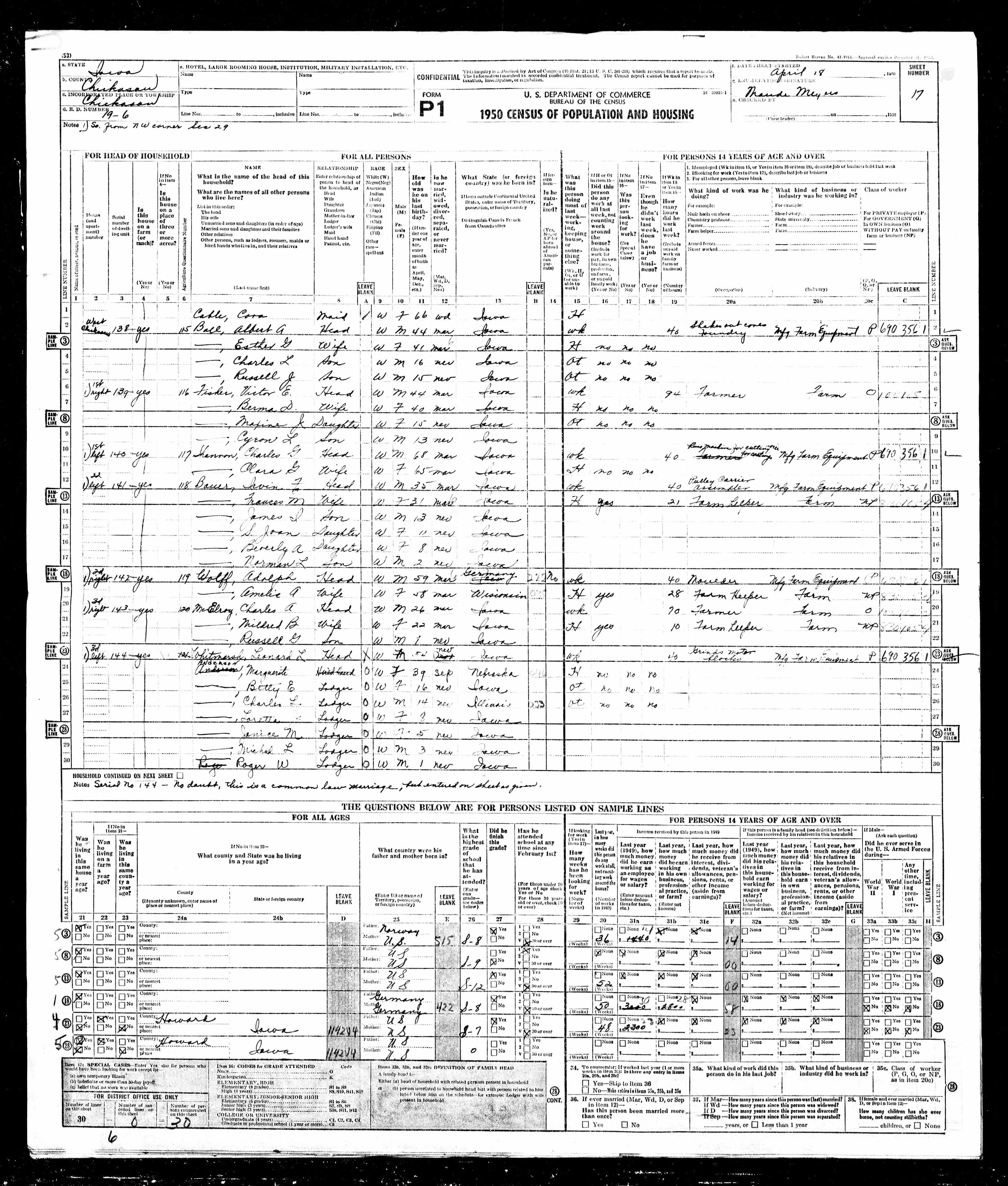 Ancestry.com Operations, Inc., 1950 United States Federal Census, NARA 43290879-Iowa-183549-0018.jpg, ED 19-6, Chickasaw, Chickasaw, IA, sheet 17, dwelling 141, line 12, Bauer, Irvin F; Database and images, Ancestry.com LLC, Ancestry.com : 2022 (http://www.Ancestry.com/ : accessed 11/03/2025); citing Seventeenth Census of the United States, 1950 U. S. Census, population schedules, National Archives and Records Administration Microfilm Publication T627 (6373 rolls), Records of the Bureau of the Census, Record Group 29, National Archives, Washington, DC, roll 5077 [Surety: 3]. |