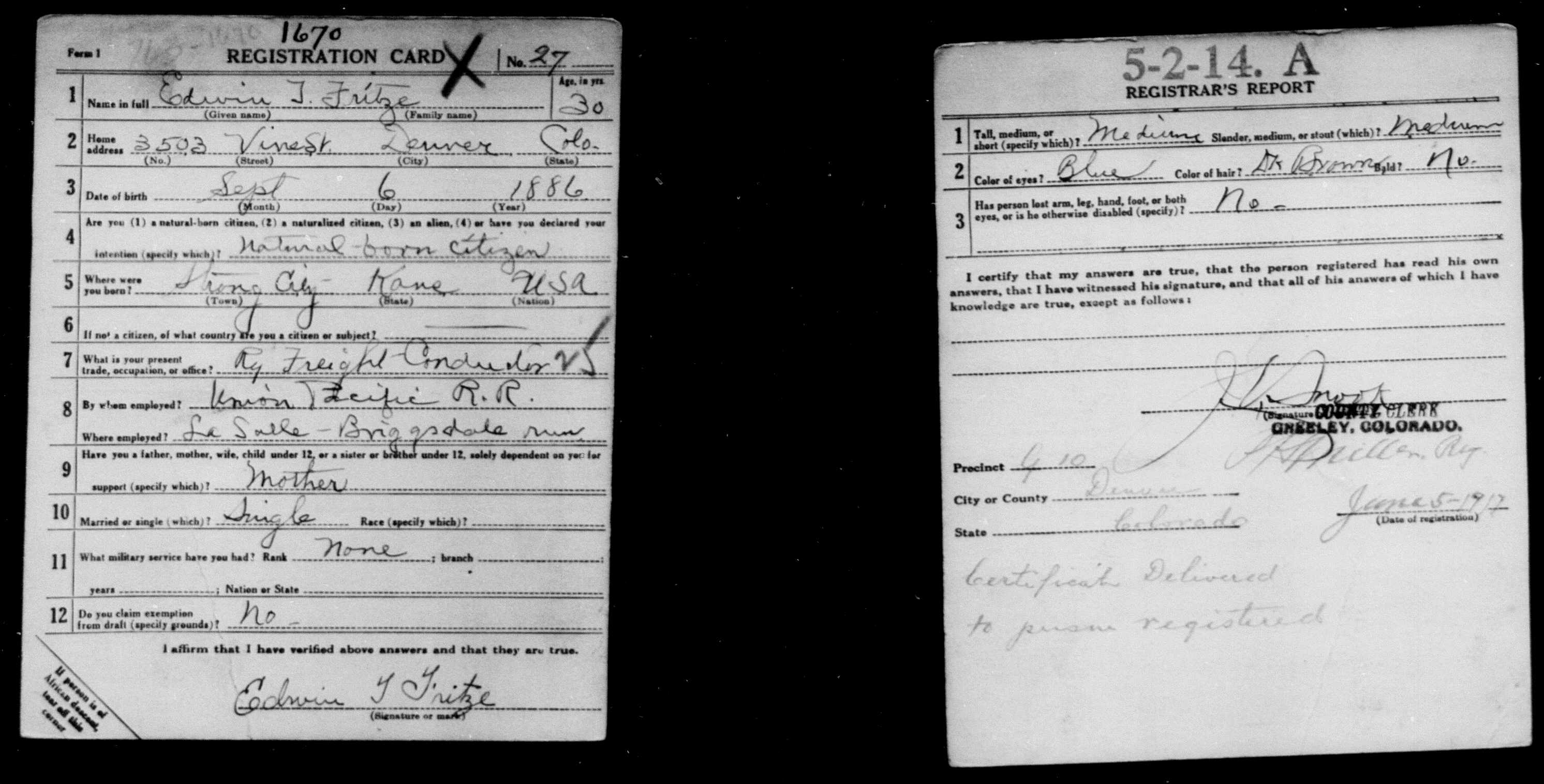 FamilySearch, United States World War II Draft Registration Cards, 1942, Edwin Theodore Fritze; Database and images, The Church of Jesus Christ of Latter-Day Saints, FamilySearch : n.d. (http://FamilySearch.org/ : accessed 11/12/2016); citing National Archives and Records Administration, Records of the Selective Service System, RG 147, Washington, DC, microfilm publication M1936, M1937, M1939, M1951, M1962, M1964, M1986, M2090, and M2097, Colorado, Denver County, Serial U-1690 [Surety: 3]. |