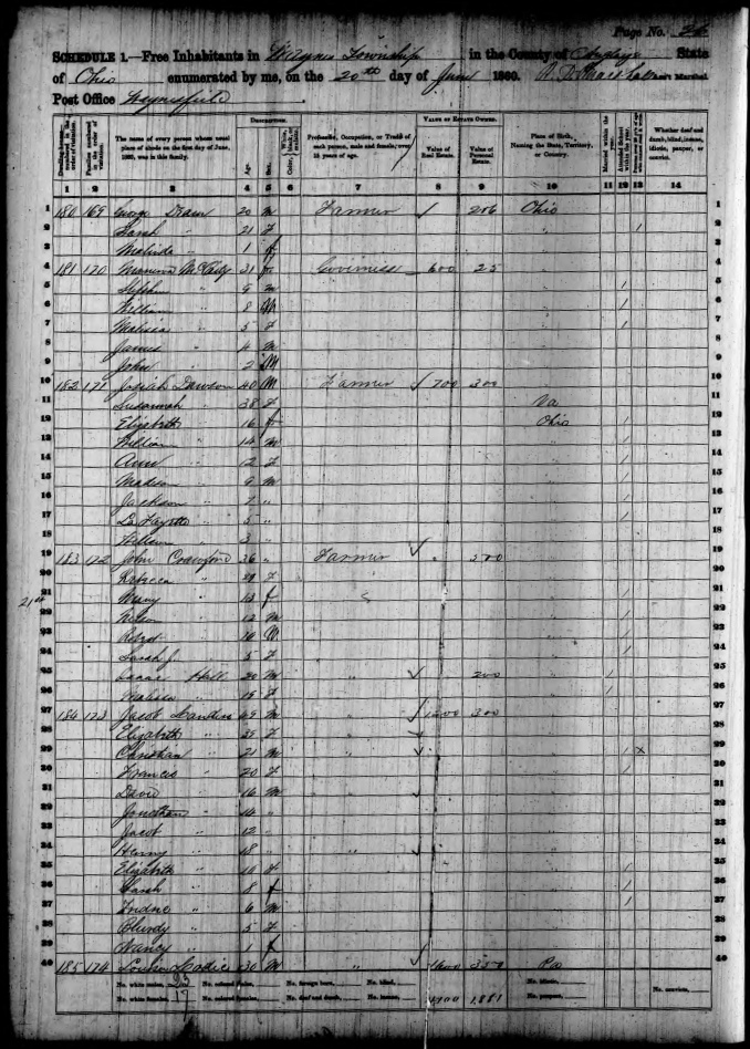 Ancestry.com Operations, Inc., 1860 United States Federal Census, Wayne, Auglaize, OH, page 26, dwelling 183, family 172, line 25, Isaac Hall; Database and images, Ancestry.com LLC, Ancestry.com : 2009 (http://www.Ancestry.com/ : accessed 01/09/2020); citing Eighth Census of the United States, 1860 U. S. Census, population schedules, National Archives and Records Administration Microfilm Publication M653 (1438 rolls), Records of the Census Bureau, Record Group 29, National Archives, Washington, DC, roll 931, image 408 [Surety: 3]. |