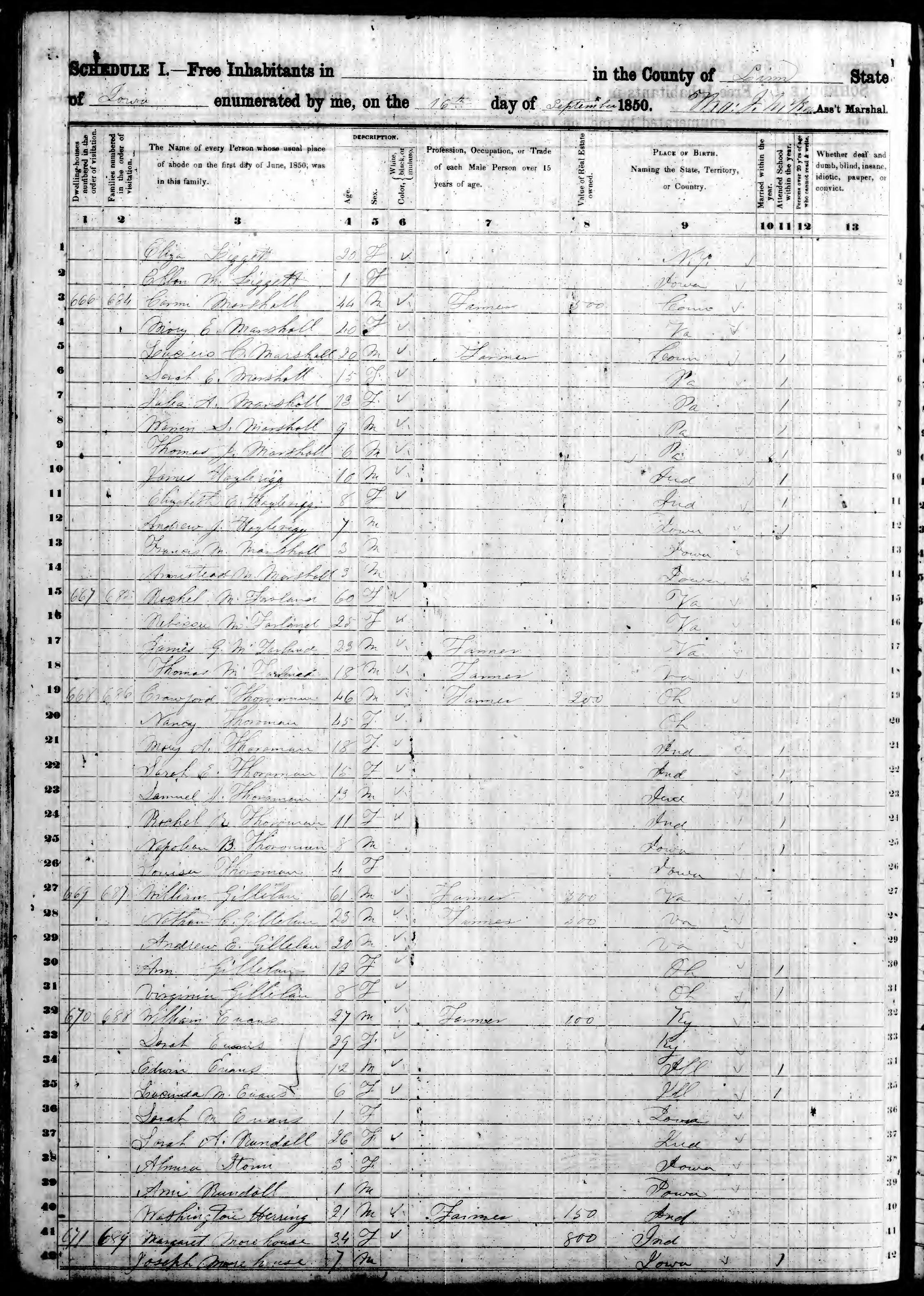 Ancestry.com Operations, Inc., 1850 United States Federal Census, Linn County, IA, page 88, dwelling 666, family 684, line 4, Mary E Marshall; Database and images, Ancestry.com LLC, Ancestry.com : 2009 (http://www.Ancestry.com/ : accessed 02/07/2017); citing Seventh Census of the United States, 1850 U. S. Census, population schedules, National Archives and Records Administration Microfilm Publication M432 (1009 rolls), Records of the Census Bureau, Record Group 29, National Archives, Washington, DC, roll 186, image 548 [Surety: 3]. |