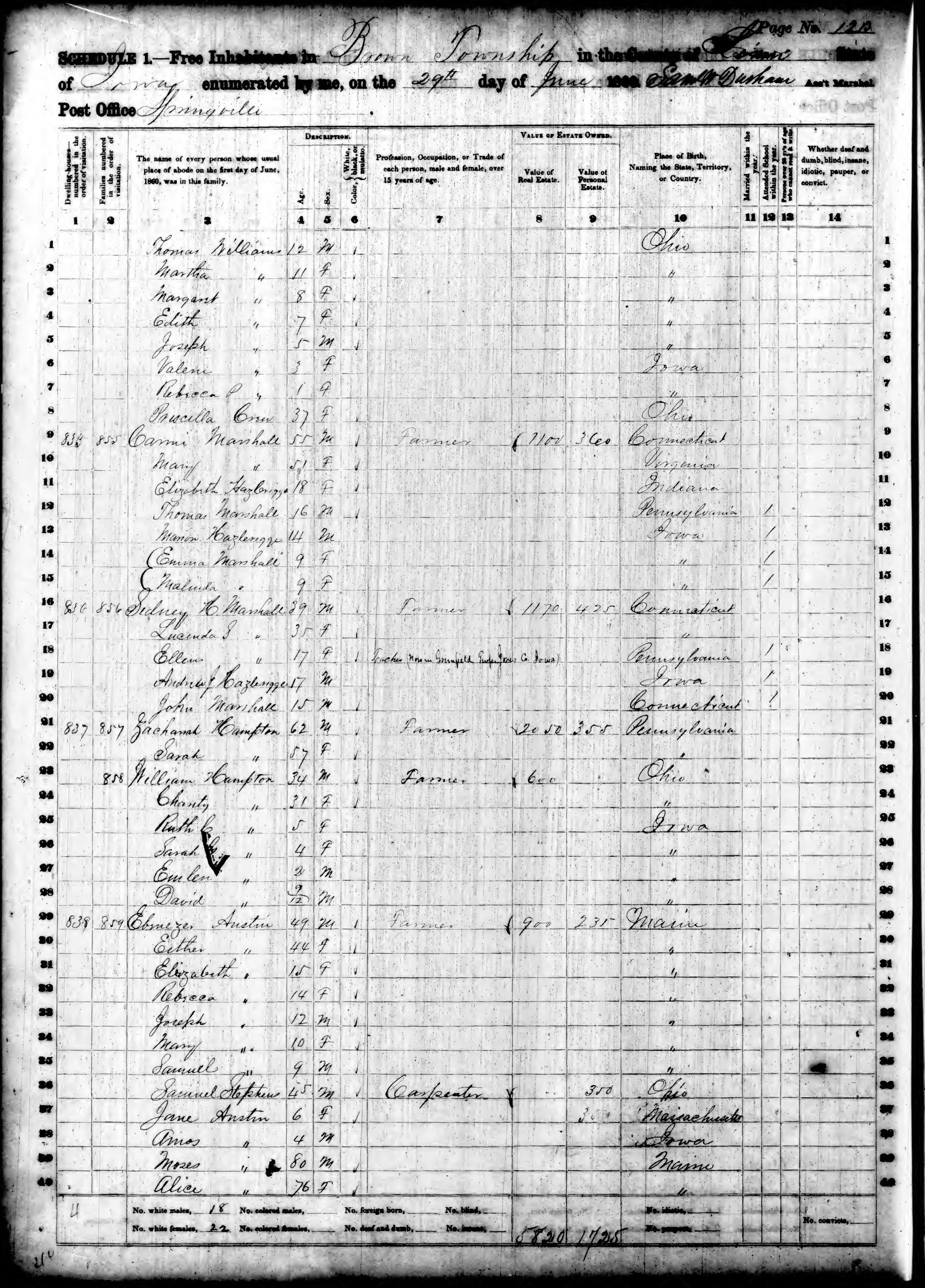Ancestry.com Operations, Inc., Iowa State Census Collection 1836-1925, 1854, Brown, Linn, IA, page 2, line 33, Marshall, Carmi; Database and images, Ancestry.com LLC, Ancestry.com : 2007 (http://www.Ancestry.com/ : accessed 08/02/2019); citing State Historical Society of Iowa, Des Moines, Iowa, Microfilm of Iowa State Censuses via Heritage Quest [Surety: 3]. |