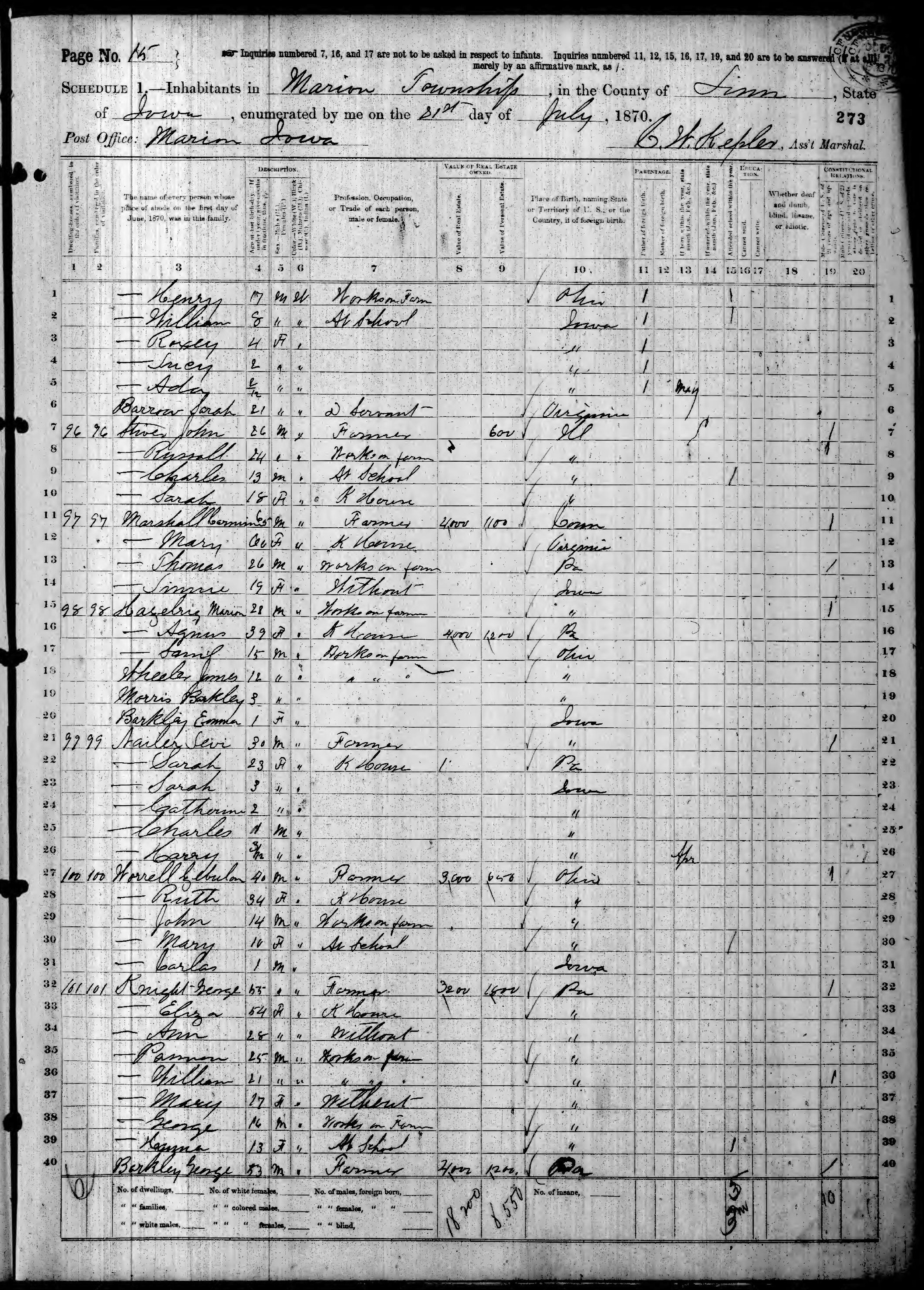 Ancestry.com Operations, Inc., 1870 United States Census, Marion, Linn, IA, page 15, dwelling 97, family 97, line 12, Marshall, Mary; Database and images, Ancestry.com LLC, Ancestry.com : 2009 (http://www.Ancestry.com/ : accessed 02/07/2017); citing Ninth Census of the United States, 1870 U. S. Census, population schedules, National Archives and Records Administration Microfilm Publication M593 (1761 rolls), Records of the Bureau of the Census, Record Group 29, National Archives, Washington, DC, roll 405, image 557 [Surety: 3]. |