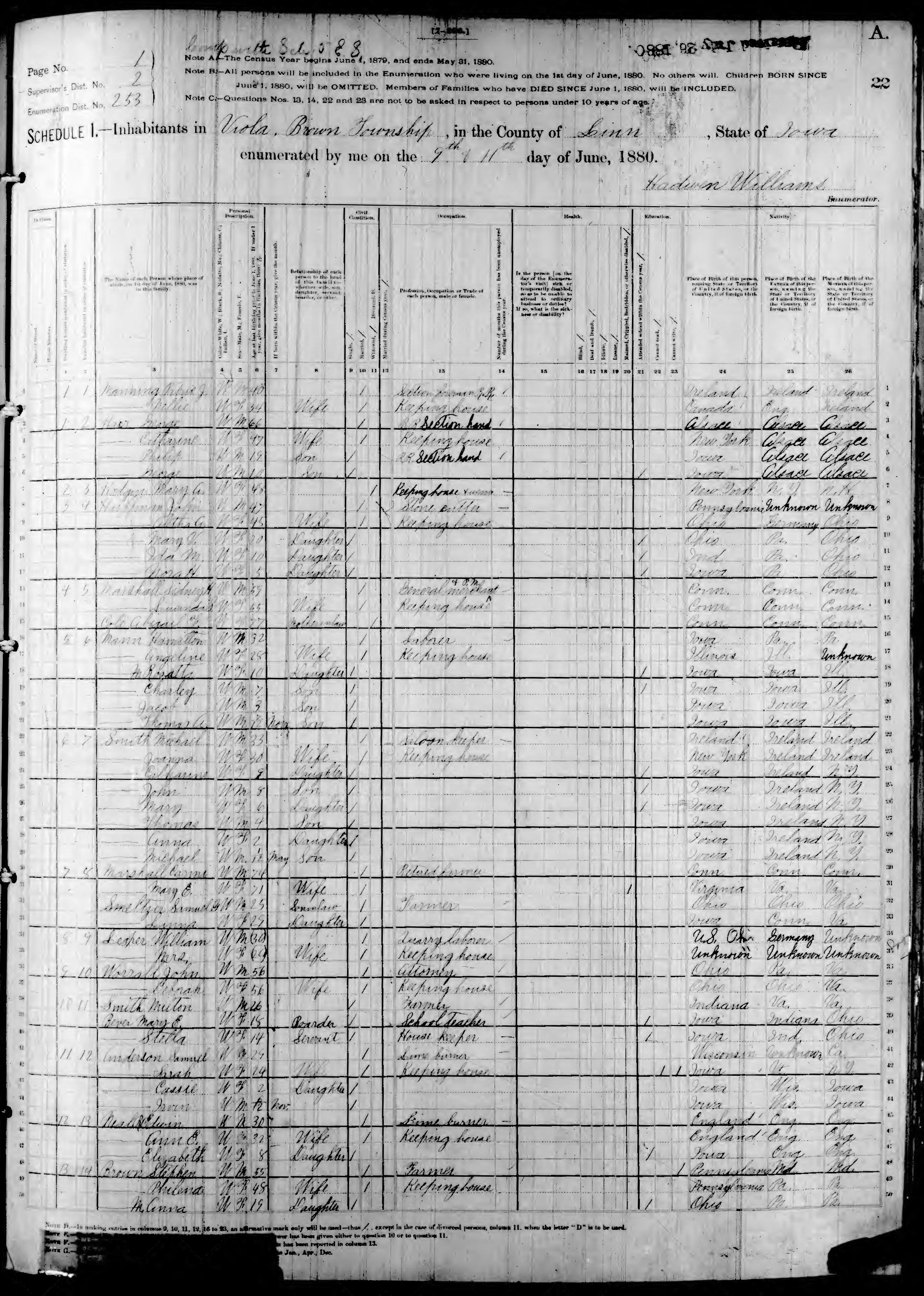Ancestry.com Operations, Inc., 1880 United States Federal Census, ED 253, Viola, Linn, IA, page 1A, dwelling 7, family 8, line 31, Marshall, Mary E; Database and images, Ancestry.com LLC, Ancestry.com : 2010 (http://www.Ancestry.com/ : accessed 02/07/2017); citing Tenth Census of the United States, 1880 U. S. Census, population schedules, National Archives and Records Administration Microfilm Publication T9 (1454 rolls), Records of the Bureau of the Census, Record Group 29, National Archives, Washington, DC, roll 351, image 47 [Surety: 3]. |