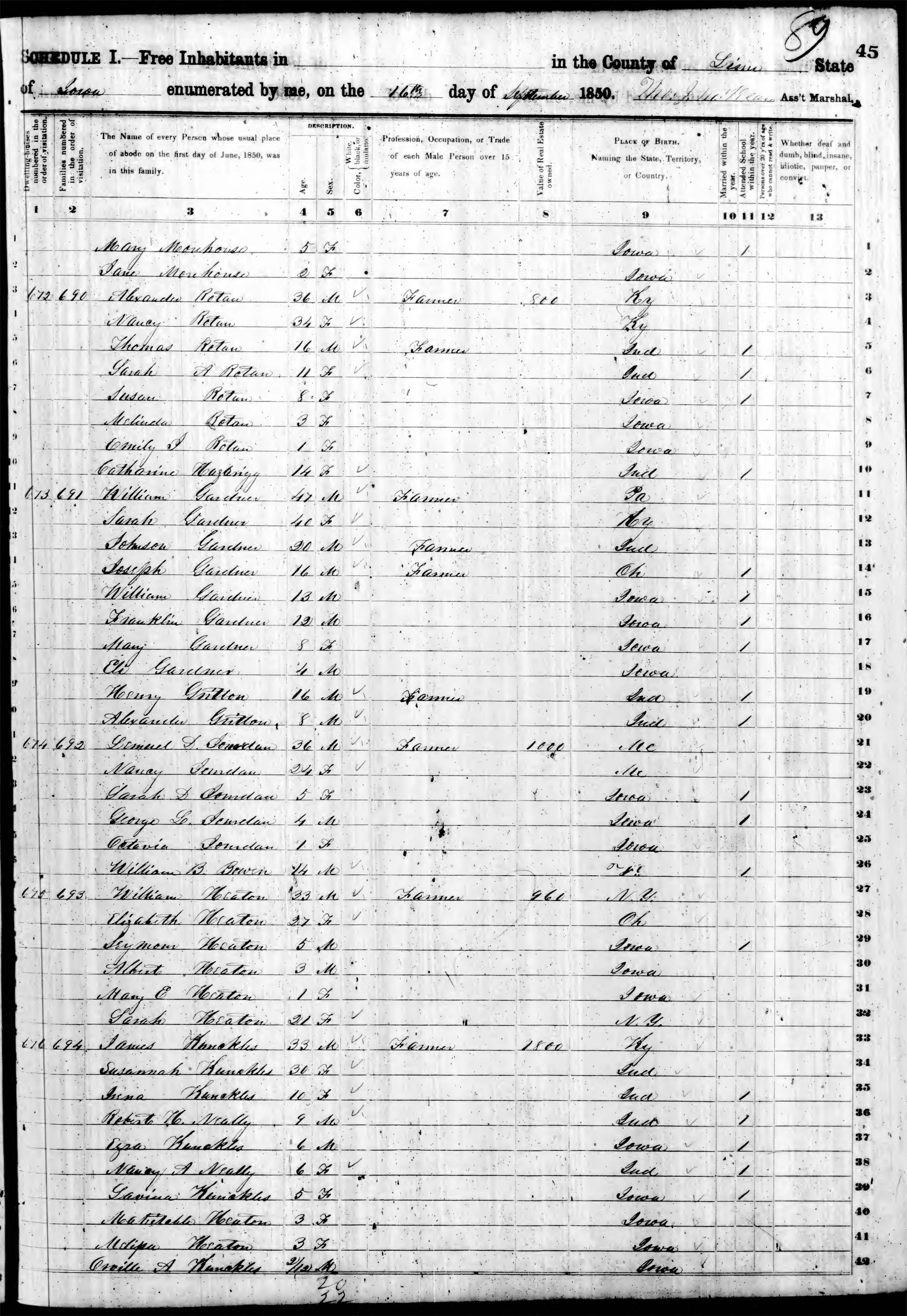 Ancestry.com Operations, Inc., 1850 United States Federal Census, Linn County, IA, page 89, dwelling 672, family 690, line 3, Alexander Rotan; Database and images, Ancestry.com LLC, Ancestry.com : 2009 (http://www.Ancestry.com/ : accessed 08/05/2019); citing Seventh Census of the United States, 1850 U. S. Census, population schedules, National Archives and Records Administration Microfilm Publication M432 (1009 rolls), Records of the Census Bureau, Record Group 29, National Archives, Washington, DC, roll 186, image 552 [Surety: 3]. |