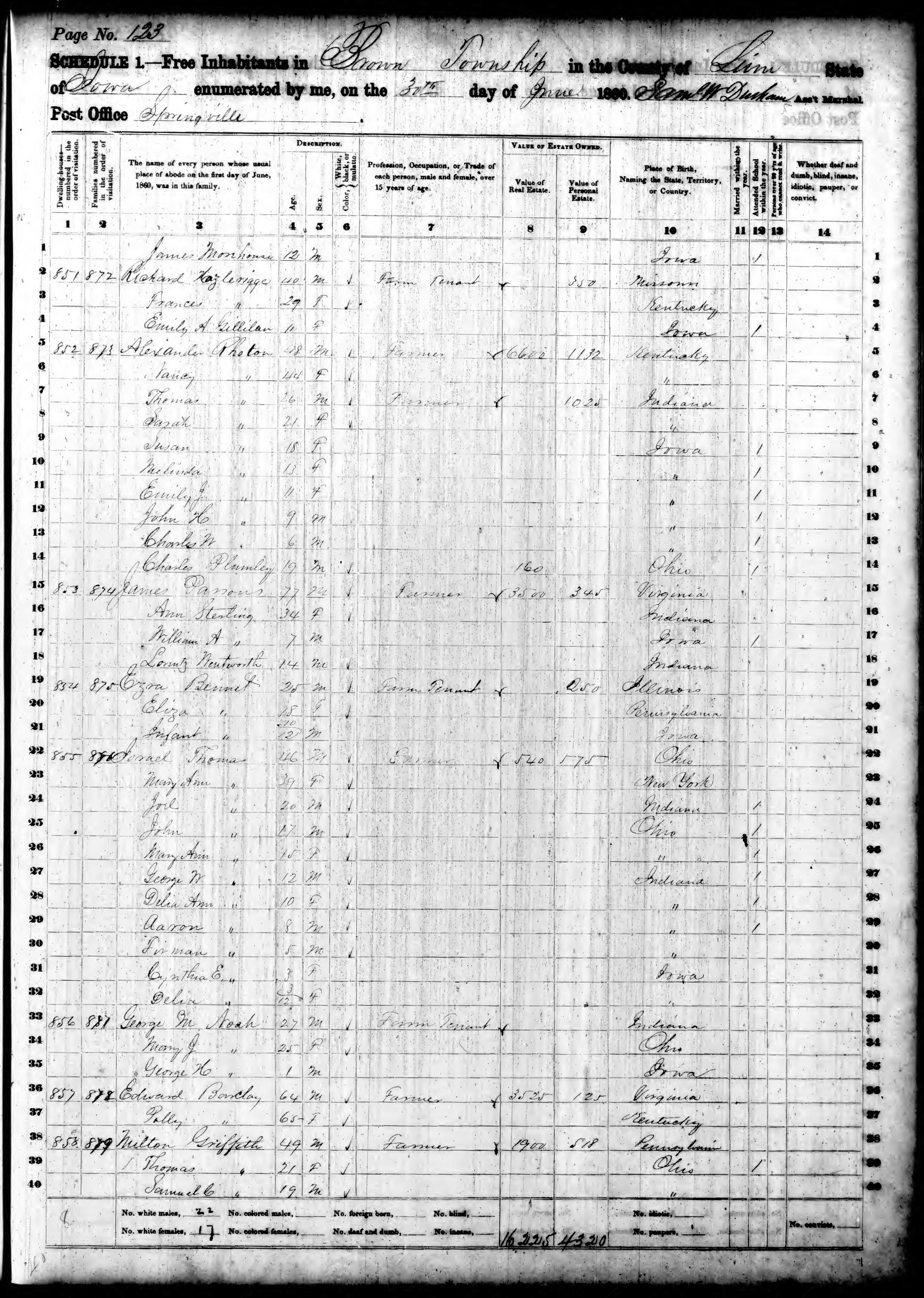 Ancestry.com Operations, Inc., 1860 United States Federal Census, Brown, Linn, Iowa, page 123, dwelling 852, family 873, line 5, Alexander Rhoton; Database and images, Ancestry.com LLC, Ancestry.com : 2009 (http://www.Ancestry.com/ : accessed 02/08/2017); citing Eighth Census of the United States, 1860 U. S. Census, population schedules, National Archives and Records Administration Microfilm Publication M653 (1438 rolls), Records of the Census Bureau, Record Group 29, National Archives, Washington, DC, roll 332, image 128 [Surety: 3]. |