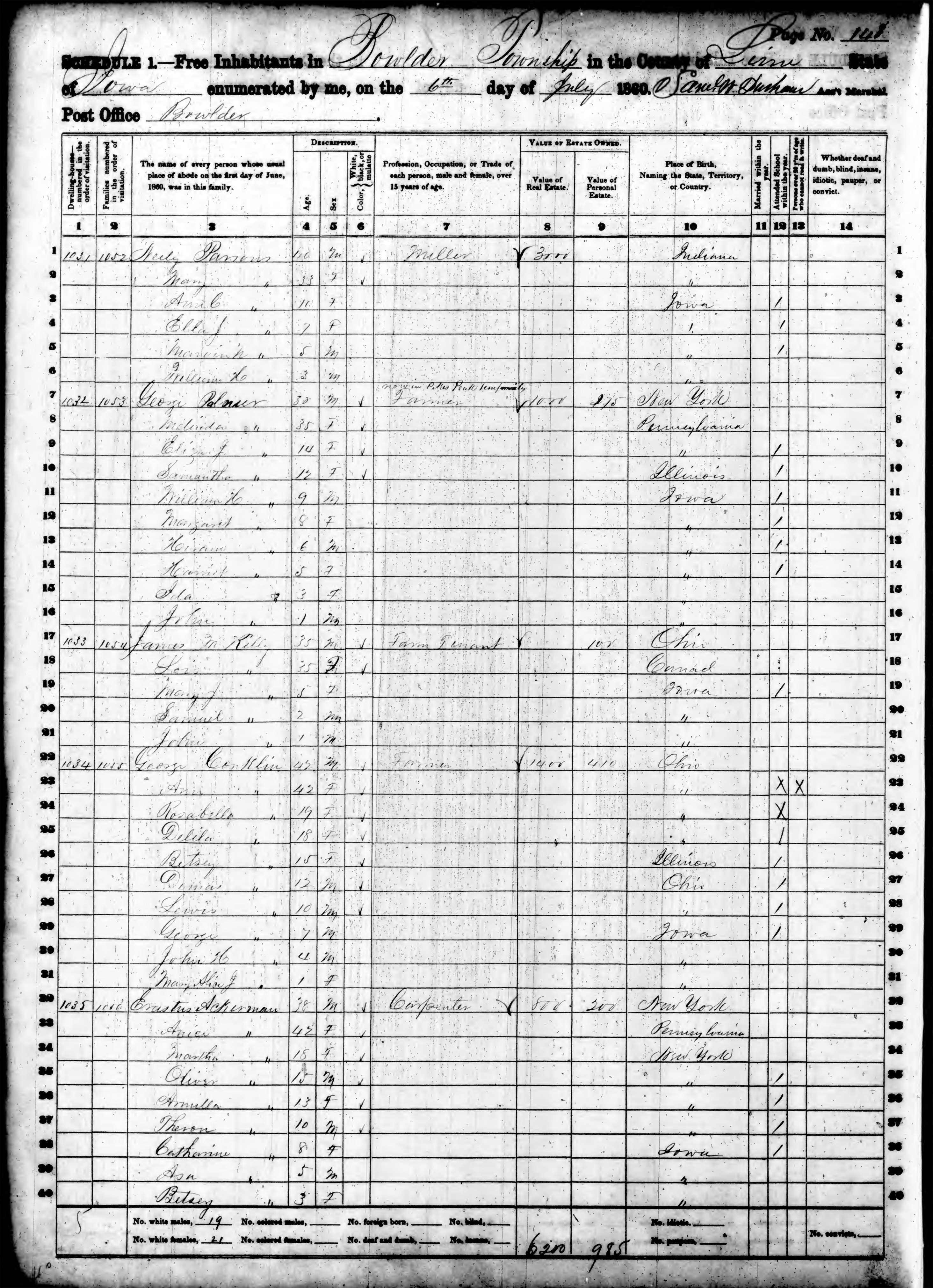 Ancestry.com Operations, Inc., 1860 United States Federal Census, Boulder, Linn, IA, page 148, dwelling 1031, family 1052, line 1, Neely Parsons; Database and images, Ancestry.com LLC, Ancestry.com : 2009 (http://www.Ancestry.com/ : accessed 08/05/2019); citing Eighth Census of the United States, 1860 U. S. Census, population schedules, National Archives and Records Administration Microfilm Publication M653 (1438 rolls), Records of the Census Bureau, Record Group 29, National Archives, Washington, DC, roll 332, image 154 [Surety: 3]. |
