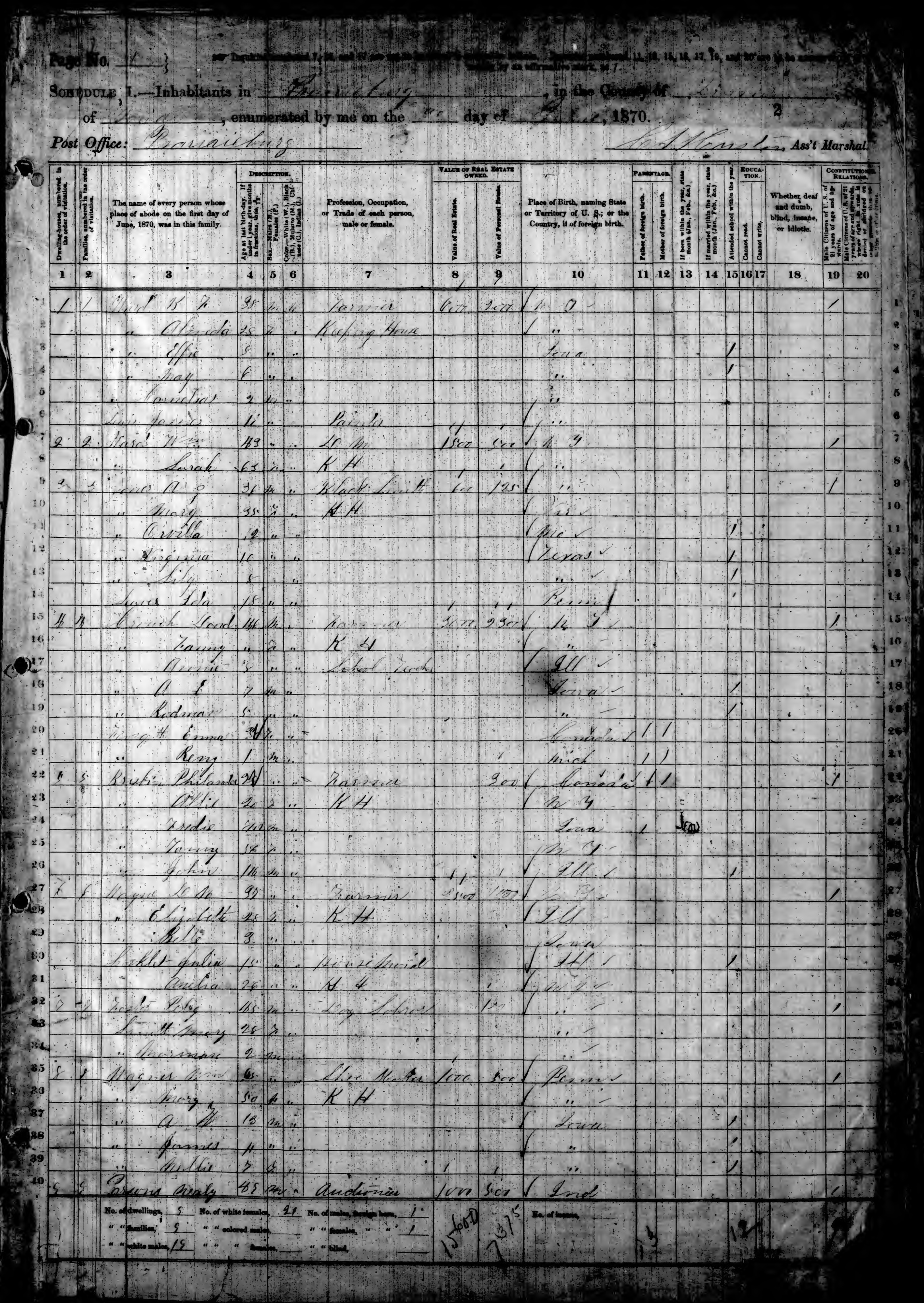 Ancestry.com Operations, Inc., 1870 United States Census, Prairieburg, Linn, IA, page 1A, dwelling 9, family 9, line 40, Parsons, Nealy; Database and images, Ancestry.com LLC, Ancestry.com : 2009 (http://www.Ancestry.com/ : accessed 09/15/2021); citing Ninth Census of the United States, 1870 U. S. Census, population schedules, National Archives and Records Administration Microfilm Publication M593 (1761 rolls), Records of the Bureau of the Census, Record Group 29, National Archives, Washington, DC, roll 405, image 52 [Surety: 3]. |